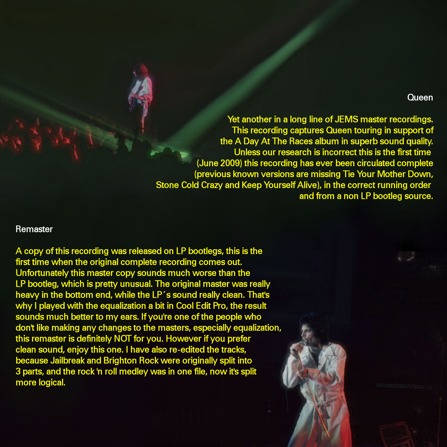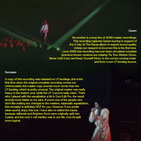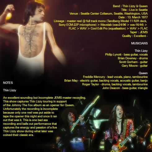 Ah, mi sarebbe proprio piaciuto vedere una data di questo tour, i THIN LIZZY (con Gary Moore) che aprono lo show seguiti poi dai QUEEN nel loro periodo d’oro. Il bootleg in questione in questa versione rimasterizzata è uscito un paio di anni fa, ma io ne sono venuto in possesso solo ora. La registrazione non è affatto male, sappiamo che i soundboard mono non lasciano respirare adeguatamente il sound, ma il tutto è comunque godibile. Un luogo comunque diffuso relativo a questo tour vorrebbe i Queen surclassati dai Thin Lizzy a livello di performance, non è esattamente così: qui i Queen suonano davvero bene e con la carica giusta. Entrambi i gruppi dunque convincono e lasciano testimonianza di quanto bello, vivo ed energico fosse il Rock negli anni settanta. Dalle copertine pubblicate qui sopra potete farvi una idea circa le scalette. Bel bootleg davvero.