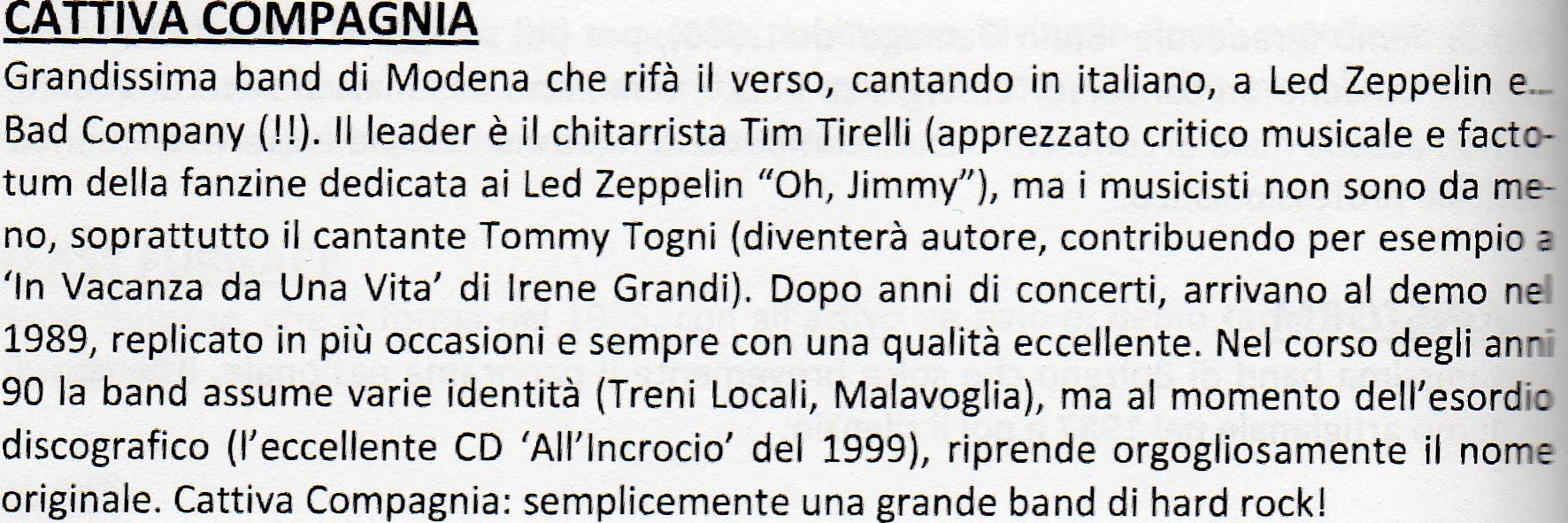 Ogni tanto, nel corso degli anni, qualcuno sparso per l’Italia riusciva a contattarmi e mi chiedeva “Senti, ma per avere il demo della CATTIVA come devo fare?”, qualche anno più tardi “devo assolutamente avere il il CD del tuo gruppo, ho letto di voi sul libro di Gianni Della Cioppa ITALIAN METAL LEGION”. Quando mi decisi a cercare il libro di Gianni, mi accorsi che era già fuori catalogo. Essendo stato ristampato di recente sono finaalmente riuscito a recuperarne una copia (insieme a IL PUNTO G.D., sempre di Della Cioppa, di cui parleremo in futuro) e il trafiletto qui sopra si trova a pagina 318. Gianni è sempre stato tenero nei miei confronti quando si trattava delle nostre canzoni, credo che in qualche maniera colpissero davvero la sua sensibilità, al di là dell’amicizia che ci lega e della passioni smisurate che abbiamo per la musica rock e per l’Inter. Nel CD di cui si parla non erano già più presenti TOMMY alla voce e LUIGI MAMMI alle tastiere, i membri storici del gruppo rimasti eravamo io e MIXI CROCI alla batteria; completavano poi la formazione il grande FAUSTO SACCHI alla voce e il pontefice del blues JOHN PAUL CAPPI al basso. Magari i complimenti sono un po’ esagerati, ma quando scrive “una grande band di Hard Rock” mi scalda davvero il cuore… il cantato in italiano, si sa, ti porta ad essere catalogato quasi sempre con la ormai insopportabile di etichetta di rock italiano.