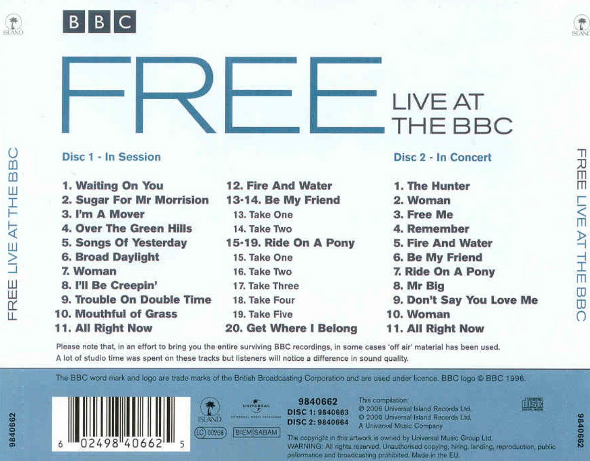 Anche per quanto riguarda i FREE, storico gruppo di hard rock blues inglese (1968-1973), la BBC ha fatto uscire (nel 2006) il classico doppio CD contenente le session che il gruppo di Paul Rodgers registrò tra il 1968 e il 1971.