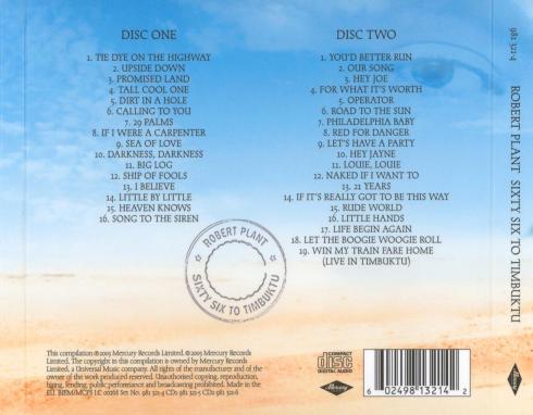 In anni in cui i “Greatest Hits” infestano, soffocano e snaturano il mercato dei cd, togliendo spesso anche ai più volenterosi la voglia di addentrarsi nelle più complicate trame degli album originali, anche la voce dei Led Zeppelin giunge a noi con un “Best Of”. Lo fa però con una logica differente e dignitosa. Questa è la prima raccolta di Plant in oltre 20 di carriera solista pre e post Zeppelin (come suggerisce il titolo dal 1966, anno del suo primo singolo, alla esibizione del “Festival In The Desert” a Timbuktu nel 2003), ed è stata curata totalmente dall’artista stesso. Il primo cd è il “best of” vero e proprio, sebbene la scelta delle canzoni lasci a desiderare: ben otto tracce su sedici sono tratte dagli ultimi due album di Robert (Fate Of Nations e Dreamland) mentre è stato del tutto ignorato il primo album. Certo, ci sono alcuni dei successi del biondo di Birmingham quali Tall Cool One, 29 Palms, Sea Of Love, I Believe, Big Log e Heaven Knows, ma dove diavolo sono i diamanti dei primi due album (ovvero gli episodi più riusciti dell’intera discografia di RP) Moonlight In Samosa, Like I’Ve Never Been Gone, Other Arms, In The Mood e Thru’ With The Two Step? In compenso è presente una mediocre outtake del periodo Now And Zen (Upside Down). Il secondo cd è invece una gioia, pieno com’è di inediti e rarità: una paio di singoli del ’66 e del ’67 (tra cui Our Song, versione inglese di La Musica E’ Finita portata al successo da Ornella Vanoni), un paio di episodi tratti dal demo del 1967 della Band Of Joy (con John Bonham alla batteria) e Operator del 1968 incisa insieme ad Alexis Corner. Road To The Sun è un discreto inedito uscito dalle session del secondo album Principle Of Moment (1983), Red For Danger un inedito elettronico del tutto trascurabile (1988). Non mancano alcune delle canzoni apparse nel corso degli anni in singoli varii e alcune riletture di piccoli classici tra cui la lucida gemma country If It’S Really Got To Be This way di Arthur Alexander e Let The Bolgie Woogie Roll presa dalla collaborazione con Jools Holland. Ancora un appunto: Far Post, apparsa some b side in un singolo del 1982 e nella colonna sonora del film White Night non doveva proprio mancare. In definitiva un best of curato e pensato nel modo giusto, peccato che, come detto, nel primo cd Robert si sia lasciato condizionare ancora una volta dalla sua mania di distaccarsi dalle fasi del suo passato che più sono vicine all’epoca Zeppelin. Peccato davvero, perché con qualche canzone in meno tratta da Dreamland (suo discutibile sebbene colto ultimo album) e l’inclusione di qualche episodio in più del periodo 1982/83, 66 To Timbuktu sarebbe stato un compendio perfetto del rock a tratti classico a tratti moderno dell’ex voce dei grandi Led Zeppelin.