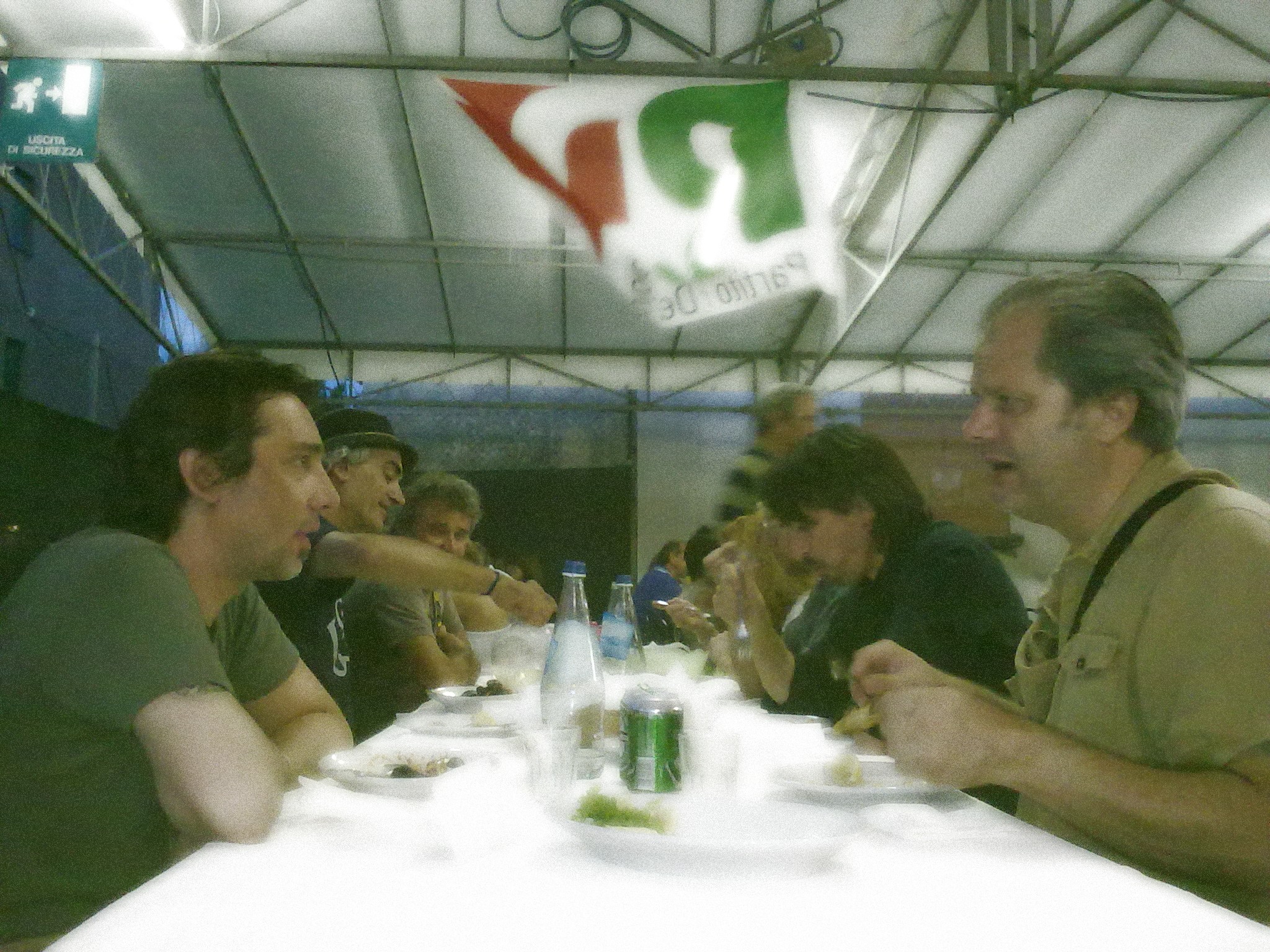 Sabato sera passato con i ragazzi che ogni tanto tornano in città, March non ce la fa e anche Liso da forfait all’ultimo ma gli irriducibili ci sono: yours truly, Sutus (come lo chiama Picca), Picca (appunto), Mixi, Jaypee e Dickey Betts…cioè, Riff. Fritto misto alla Festa Dell’Unità di Gavassa (frazione di Reggio), una di quelle feste dell’unità che tra un po’ scompariranno, fatte in una specie di grande cortile tra alcune case. Atmosfera da vecchia Emilia Romagna etichetta rossa.