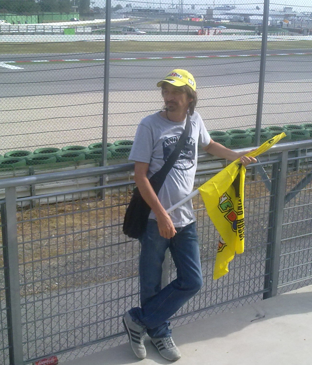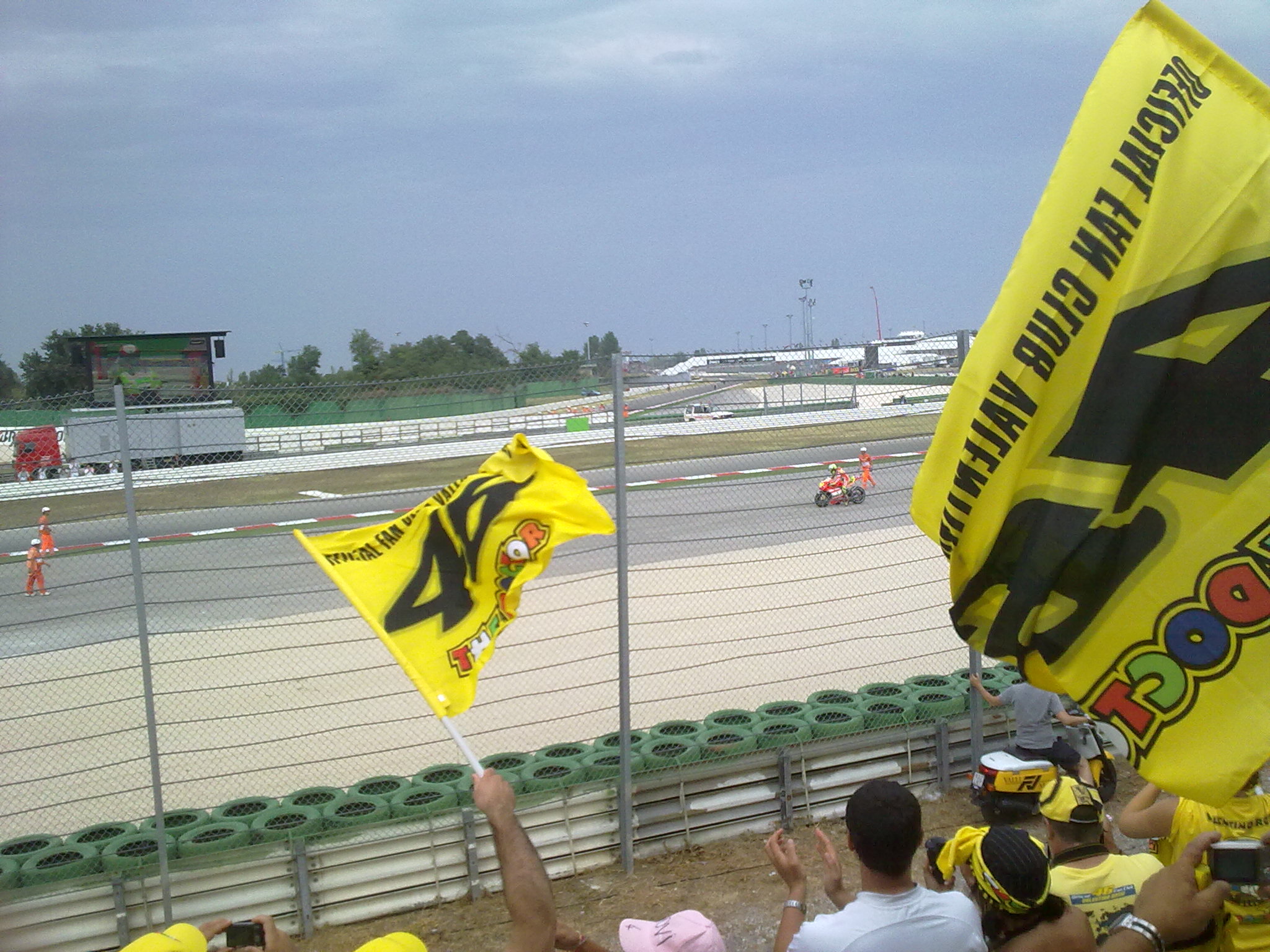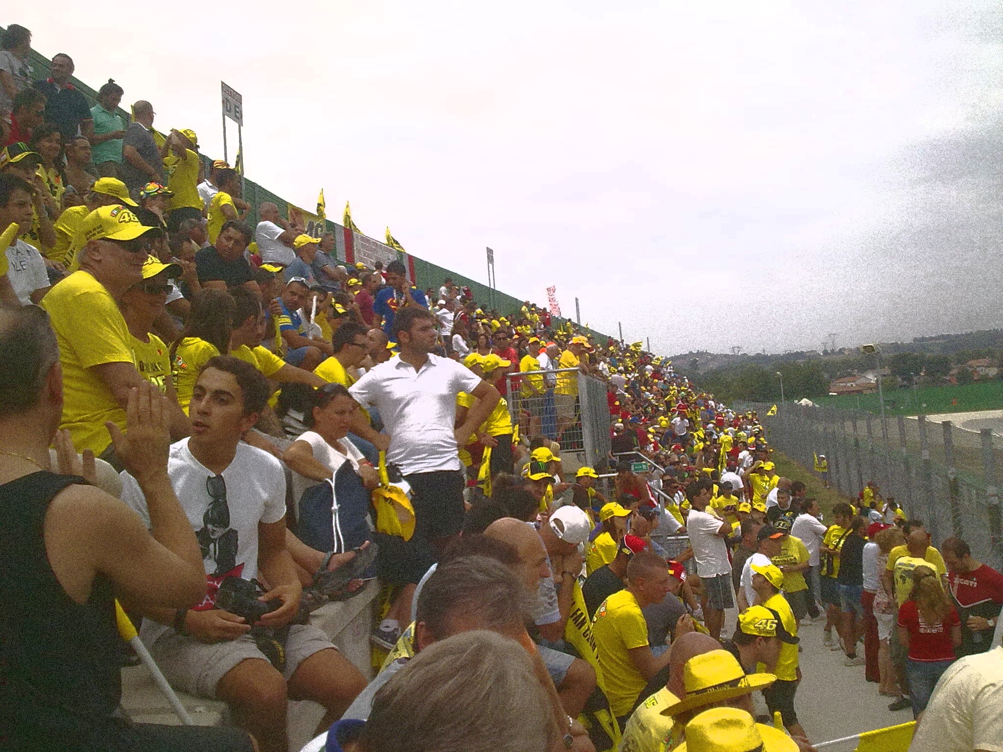 Sveglia alle 5, colazione, cappellino giallo e si parte. Grazie al poco traffico e al piedino pesante della SpeedQueen (guida lei, io sonnecchio), alle 7,50 siamo a Misano. Alle 8,15 siamo alla tribuna Brutapela, quella dove si assiepano tutti i fan di Valentino. All’entrata ci consegnano dei gadget.