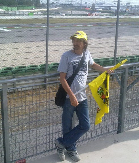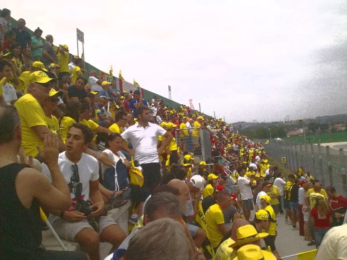Non faccio nemmeno in tempo ad ambientarmi che è già ora del Warm Up delle 125. Poco dopo tocca alla Moto 2 e infine alla MotoGP. Ogni volta che Valentino passa davanti a noi la folla impazzisce. Lo vedo passare e salutare i suoi amati tifosi, mi vengono i brividi. Roba da matti. Quando lo speaker del circuito non parla, passano il Rolling Stones: BROWN SUGAR, MISS YOU, DON’T STOP… Credevo di annoiarmi e invece la cosa non è male. Mangio qualche panino e scambio sms con Picca, Liso, Jay, Lorenz, Lalalli e Riff. Con il Dickey Betts di Quariegh ci battibecchiamo per una buona mezzoretta. Riff ….diciamo così…non è amante degli spagnoli e della Spagna, quindi tifa contro tutti i piloti iberici, mentre io mi sento vicino a quelle genti e quindi (Lorenzo a parte) ho in simpatia Terol, Marquez, Pedrosa e compagnia. Sono gli inglesi a non starmi simpatici (che invece Riff adora). Terol vince la 125, Marquez la Moto 2 e Riff da in escandescenze, mentre io gli ridacchio alle spalle.
