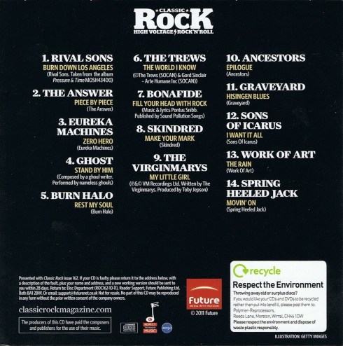 I Cd allegati alle riviste musicali generalmente non mi piacciono nemmeno po’, tranne rare eccezioni (che riguardano soprattutto la rivista MOJO); anche questo è un cd da dimenticare. Essendo però un best (secondo Classic Rock Magazine) della musica uscita nel mercato Rock fino ad ora, mi pongo una domanda: ma la situazione è così deprimente o sono io imprigionato negli anni settanta? L’unico pezzo che mi piace è l’ultimo, ovvero Movin’ On dei SPRING HEELED JACK, una sorta di The Jack degli AC/DC con un trattamento Rolling Stones.
