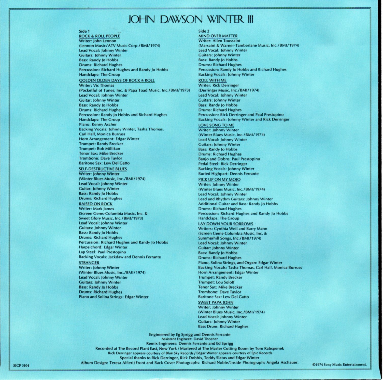 JOHN DAWSON WINTER III è il quarto album da studio del periodo rock di Johnny Winter (gli altri sono AND, STILL ALIVE AND WELL e SAINTS AND SINNERS) ed è probabilmente il meno riuscito di quattro, ma questo non vuol dire che sia un disco mediocre, riulta essere infatti un buon , a tratti ottimo, album di (Hard) Rock Blues Americano degli anni settanta. Si apre con un pezzo di John Lennon che però non è che sia chissà che e segue con un rock and roll preciso e carino. In SELF DESTRUCTION si apprezza senza riserve la fiera solista di Winter su una base di robusto rock blues; RAISED ON ROCK è un bel rock anni settanta con un altro assolo infuocato mentre  in STRANGER Winter si fa più intimista e riflessivo. Di nuovo anni settanta con MIND OVER MATTER