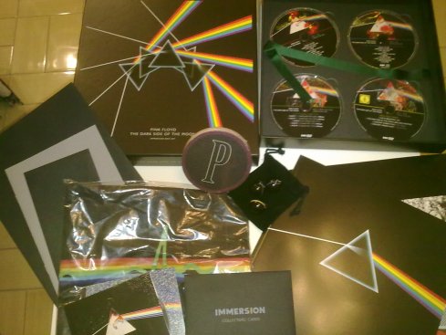 Arriva poi Lasàurit e mi regala il PINK FLOYD “Dark Side Of The Moon” Immersion box set. Mi tremano le gambe, mi batte il cuore…6 dischetti ed una confezione straordinaria…sciarpa, biglie di marmo, vario merchandising, un photo book, un booklet e tante altre cosine. Una meraviglia. Lo abbraccio questo box set, me lo tengo stretto al cuore. .. la mia bassista preferita mi vizia. Lo so.