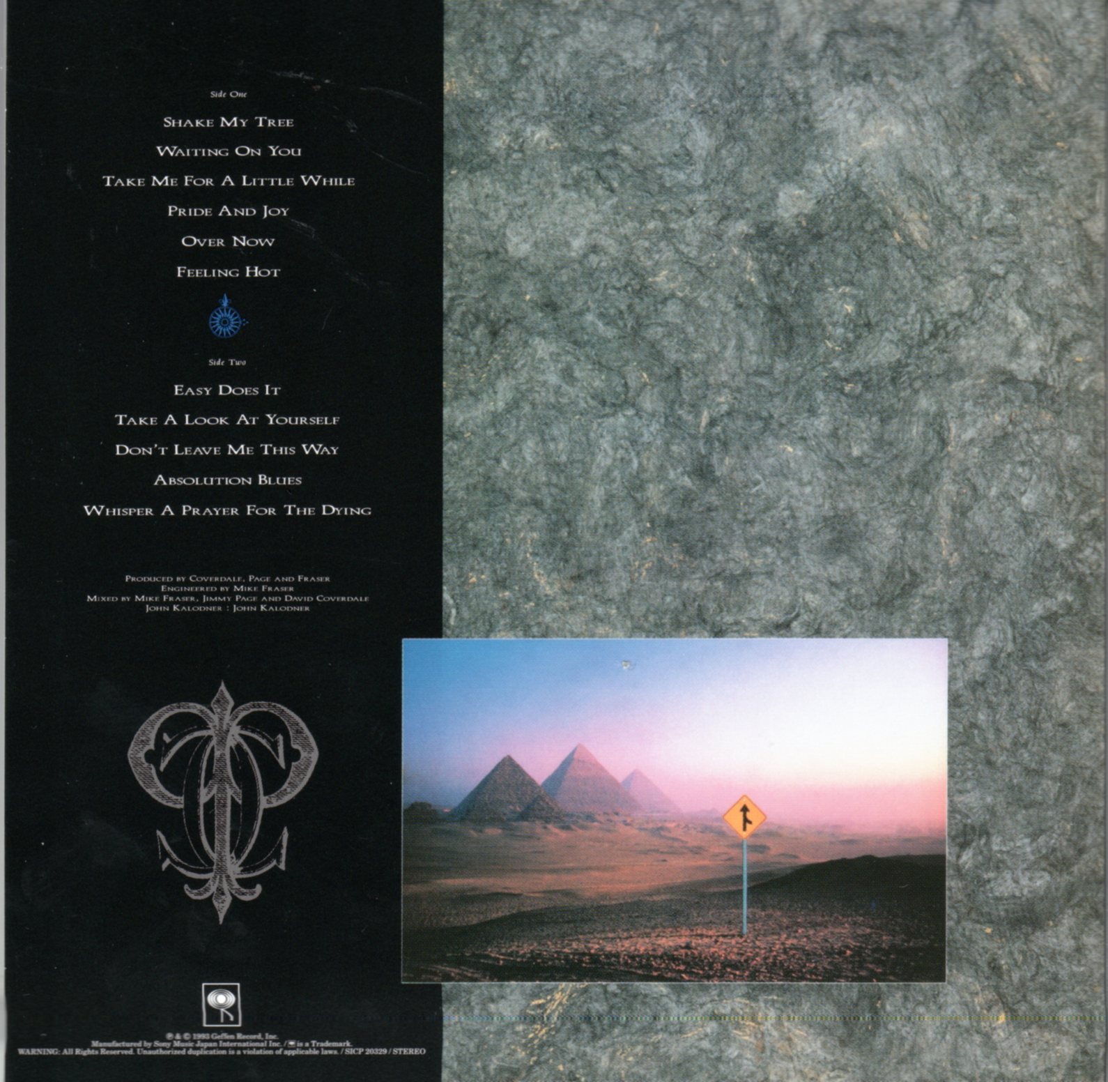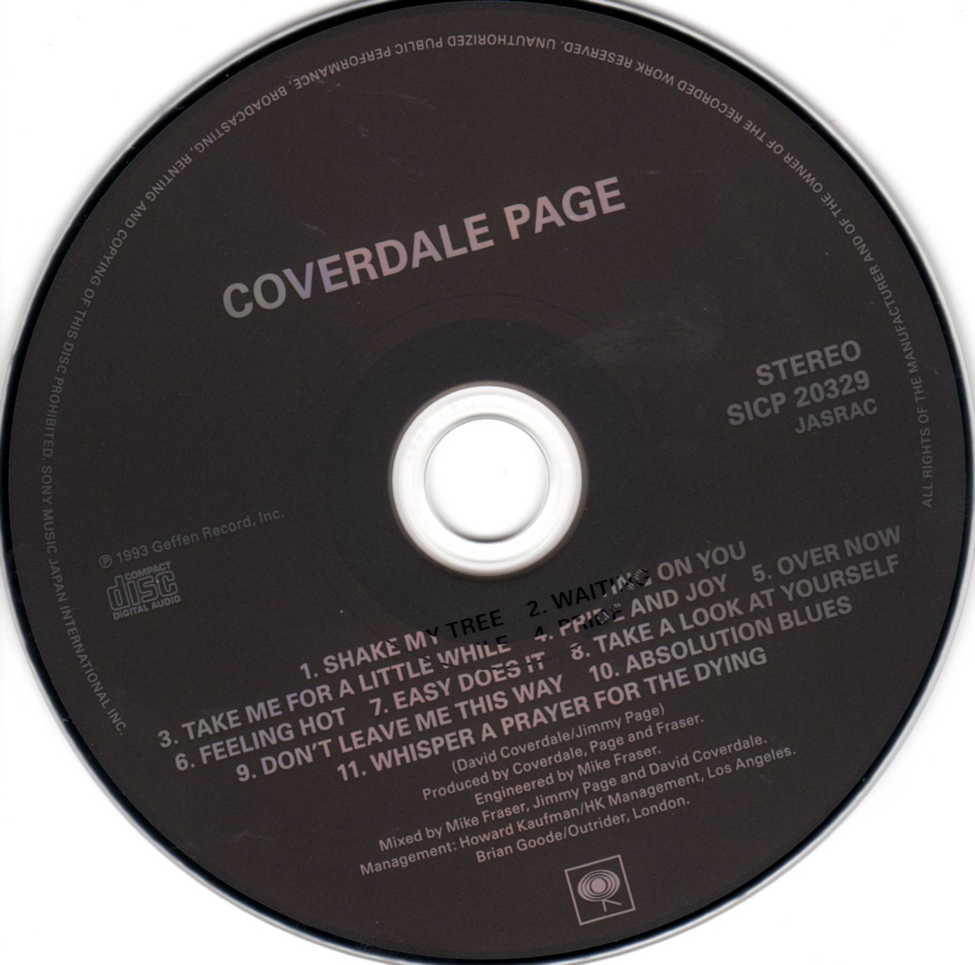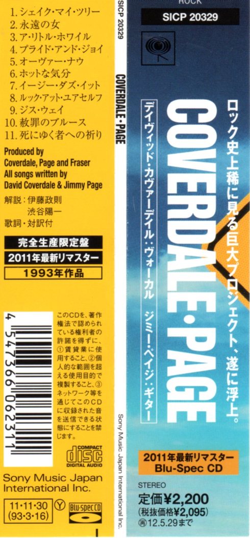 Versione giapponese (e di chi altro se no?) blu-spec cd dell’album di Coverdale – Page. Ho provato a cogliere le differenze con la edizione originale del 1993 sullo stereo di casa: forse sarà la suggestione ma mi sembra che questa sia più cristallina. E’ stata ad ogni modo una occasione per riascoltare questo album. Ho dato tre TTT e mezzo perché cerco di essere obbiettivo anche con i miei musicisti preferiti (Jimmy Page, appunto), ma la pancia mi avrebbe fatto aggiungere una T in più. Sì, perché sebbene in passato non mi sia fatto incantare più di tanto da questo album, riascoltandolo ho provato un gran gusto nel risentire certe cose, quelle meno scontate. SHAKE MY TREE, TAKE ME FOR A LITTLE WHILE, PRIDE AND JOY e TAKE A LOOK AT YOURSELF si sono ascoltate fin troppo, buoni brani rock che a volte sconfinano nel ridicolo grazie a comunque spiritose allusioni di Coverdale e rovinati a tratti da un uso cscelleratodelle tastiere (quei tappeti di tastiere in TAKE ME FORV A LITTLE WHILE sono insopportabili. Tipici della fine degli anni settanta, nel risentirli ti incazzi. Anche solo l’uso del gergo “tappeti di tastiere” andrebbe bandito. Le tastiere non devono essere usate cosi! Punto.).