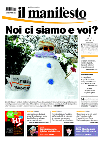 Polbi mi ha anticipato scrivendo ed inviandomi queste due righe. Pubblico quindi molto volentieri questo pensiero…anche se sono anni e anni che IL MANIFESTO fatica e che continua a chiedere campagne di sostegno ai propri lettori. Certo, un giornale dovrebbe reggersi sulle proprie gambe da solo, se non ce la fa giusto che chiuda. Questo in una società più o meno civile…da noi dove il mercato non è proprio liberissimo, dove c’è chi controlla e possiede buona parte dei media e della informazione, mi sembra il minimo per gente come noi cercare di far sopravvivere il giornale in questione il più a lungo possibile.