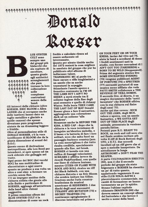 Eppure, in una sera come questa, una sera in cui salgo in soffitta e mi capitano in mano questo ed altri numeri di FLASH e i numeri di Metal Shock, e vedo il mio nome comparire accanto ad articoli che oggi mi sembrano ingenui e naif, mi dico che tutto sommato è stata una bella esperienza, che mi sentivo fiero di scrivere sullo stesso giornale in cui scrivevano Trombetti, Riva e che dopotutto mi sentivo bene nello scrivere di rock. Qui sotto il mio pezzo su Buck Dharma alias Donal Roser dei BLUE OYSTER CULT.