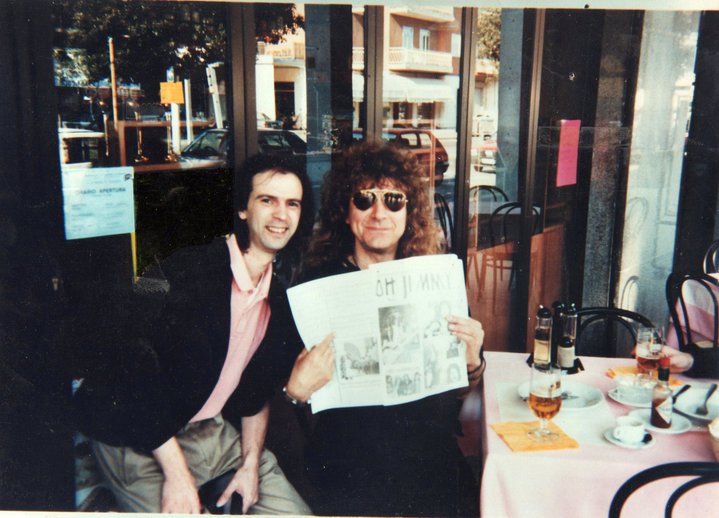 Stamattina Frank ha postato sulla mia bacheca facebook una foto tratta da una album del mio amico Mauro Monaco, foto che lo ritrae in compagnia di Robert Plant. Immagino sia stata scattata il 1 giugno del 1990, il giorno dopo in cui io e Frank lo avevamo incontrato in occasione della sua  partecipazione al Festivalbar a Chioggia…Robert che legge la mia fanzine OH JIMMY…mica male.