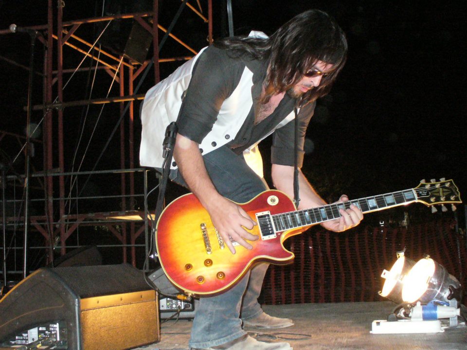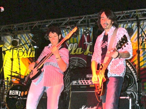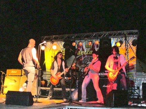Tocca a noi, due minuti per collegarci agli amplificatori già presenti sul palco, un minuto di soundcheck con HELLO THERE dei CHEAP TRICK e poi Lele parte con l’intro di ROCK AND ROLL. Il rombo delle LES PAUL, la veloce occhiata con Riff a bordo palco, la sicurezza della Saurit, lo sguardo attento di Lele, l’ugola d’oro di Pol…un bel venticello mi spira tra i capelli…le poche decine di pubblico dell’inizio si trasformano ben presto in un bel pienone. D’incanto la dispepsia non la sento più. Sono lì, sto per partire con l’assolo che non sarà difficilissimo ma non è nemmeno facilissimo, butto la mano, chiudo gli occhi e sono a Knebworth. Potenza del Rock and Roll.