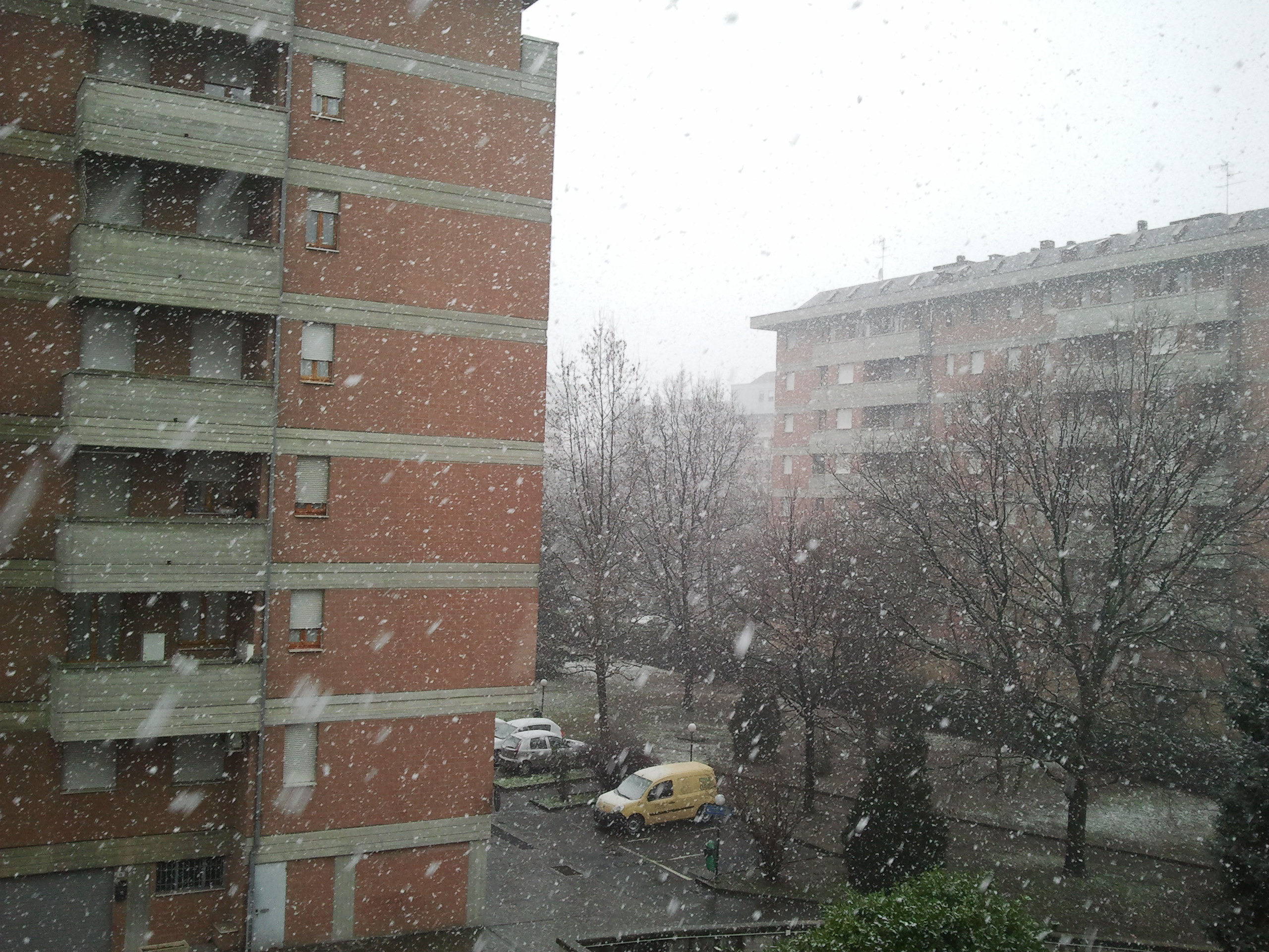 Prima il dovere e poi il (dis)piacere: finito l’incontro col cliente mi dirigo da Brian. Il vecchio sta finendo il pranzo preparatogli da AmicaDellaForza. E’ su di morale, non ama la neve, ma il tempo atmosferico si prende una bella fetta dei suoi pensieri, così oggi appare impegnatissimo. Lo lavo, lo metto in tuta e gli canto vecchi traditional reggiani tipo “l’è tri dè ca piov e ca neva e me marì l’en ancòra gnu a cà“. Nel momento in cui la nevicata diventa decisa il vecchio Brian raggiunge il massimo della eccitazione “Mo’ dio bon sa nèva!”…