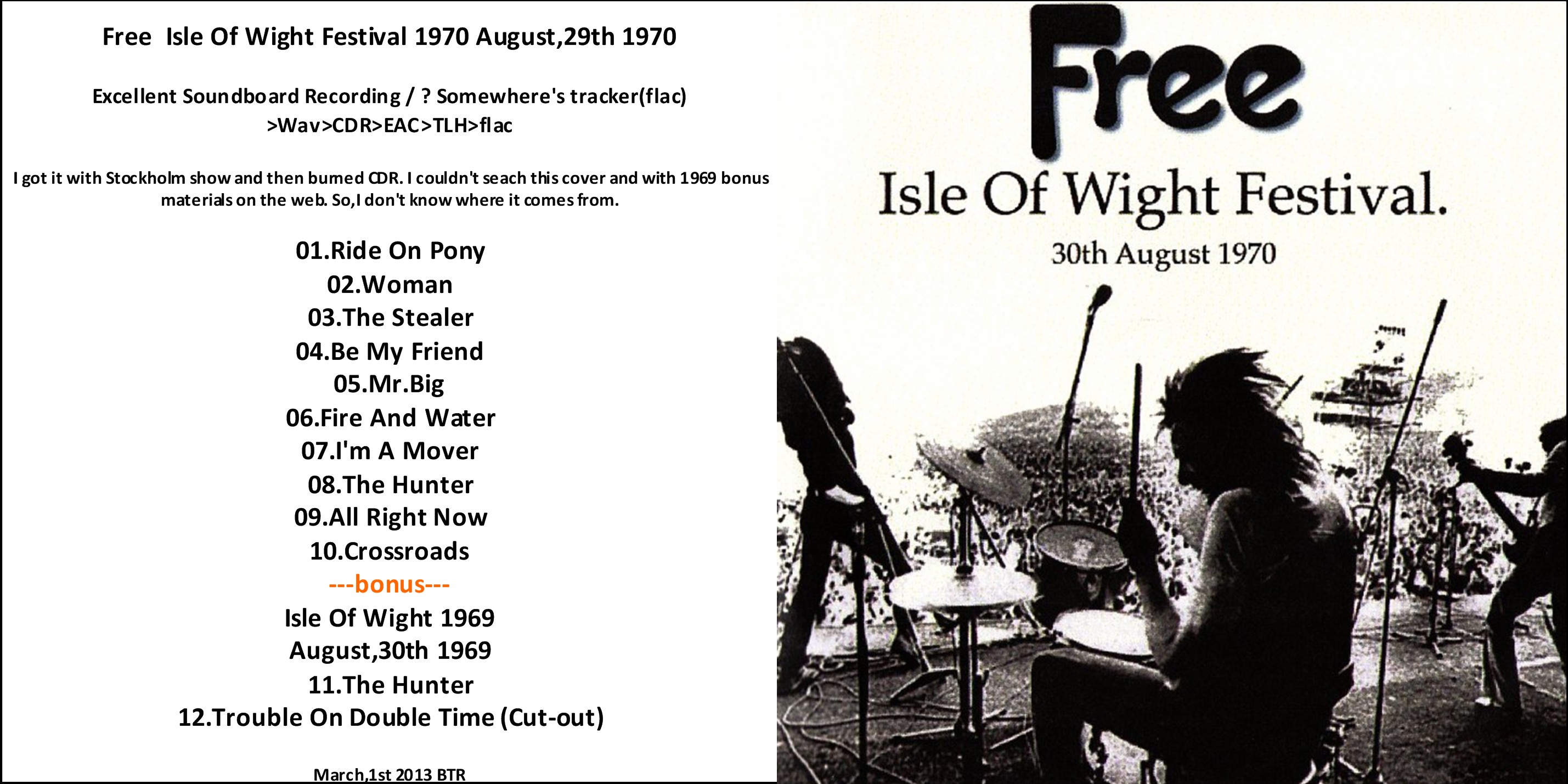 I filmati dei tre pezzi disponibili dei FREE all’IOW sono il visual per eccellenza di questa band formidabile. 4 giovani uomini pieni di blues e di testosterone ripresi nell’estate del loro più grande successo, ALL RIGHT NOW. Questi tre pezzi e le rimanenti tracce audio sono disponibili sul divudi ufficiale FREE FOREVER, ma…chi è che si ascolta un divudi? Così eccomi alle prese col bootleg relativo: qualità audio eccellente e sincerità assoluta. Quello che si sente è quello che è accaduto.