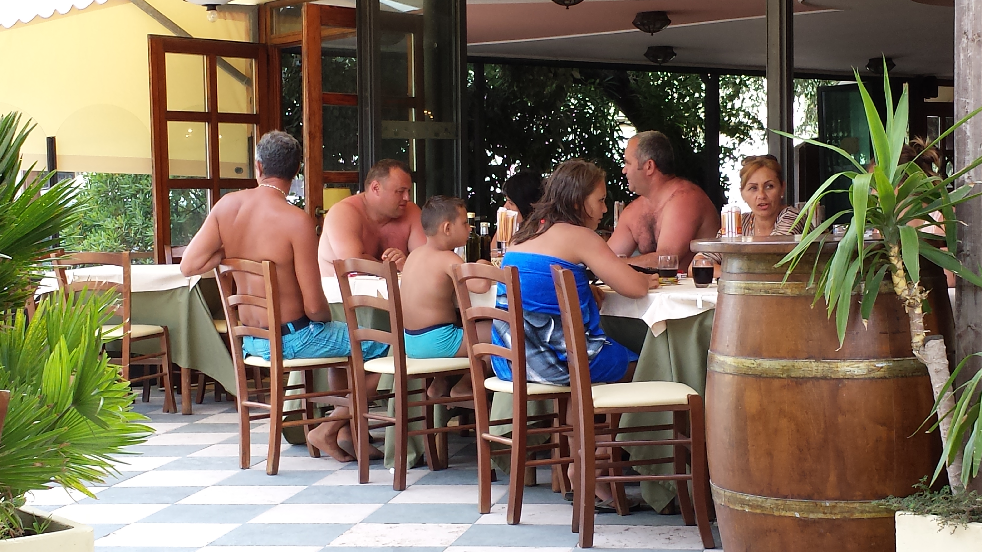 …russi che arrivano al ristorante sul lungomare in costume e senza ciabatte e che riescono a convincere il titolare (che in un primo momento non voleva farli entrare) a farli pranzare almeno sotto al pergolato…