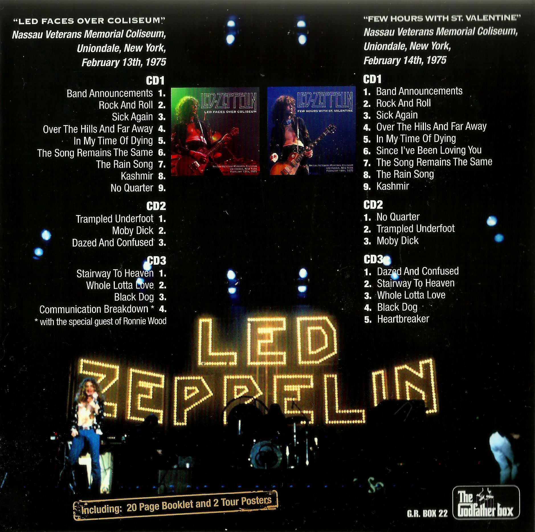 Solo due note per non ripetermi troppo: qualità sonora eccellente (come quasi tutti i soundboard del 1975), performance corrotte dallo pessimo stato della voce di PLANT e dal chitarrismo non porprio impeccabile del PAGE post 1973. Nel concerto del 13 però PLANT si difende e bisogna pur dire che nel febbraio di quel tour PAGE non era proprio da buttar via. La GODFATHER nel riproporre sul mercato questi due concerti ha cercato di addolcire la compressione terribile che va di moda in questi ultimi anni e che fu quindi usata anche dalla EMPRESS VALLEY. Mi pare che in questo caso la musica respiri di più e che dunque questa nuova uscita sia la migliore per quanta riguarda i silver relativi a queste due date. *