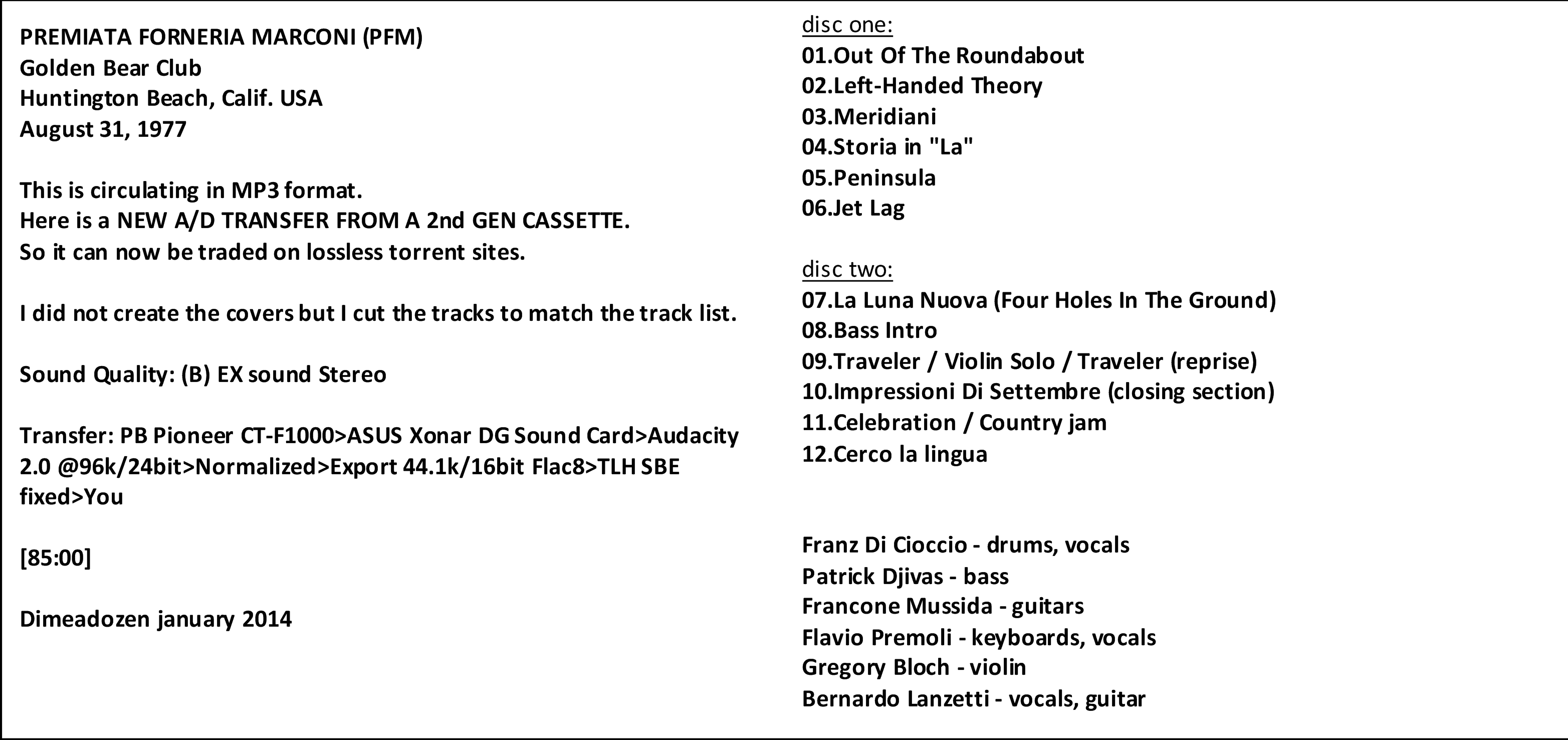 Chi legge da un po’ questo blog sa che considero la PFM uno dei quattro grandi gruppi progressive insieme a ELP, YES e GENESIS. Questo bootleg non può che confermare la mia convinzione. Maestria, musicalità, bei pezzi…nulla da invidiare ai loro colleghi più famosi. Al di fuori dell’Italia la PREMIATA è stata. e tutto sommato ancora è, una cult band: il seguito che aveva magari non poteva avvalersi dell’aggettivo oceanico, ma era di un entusiasmo e di una fedeltà davvero fuori dall’ordinario. Il pubblico in questa registrazione lo lascia capire chiaramente: applausi fragorosi, urla, sentimento di gioia e di buone vibrazioni…che spettacolo. E poi sentire i pezzi di JET LAG in versione live, il violino del povero GREG BLOG, la voce di LANZETTI…che meraviglia. Non trovo differenze tra questo bootleg della PFM e quelli dello stesso periodo delle tre band già citate se non quella relativa al posto in cui si tenevano i concerti: la PREMIATA suonava al Golden Bear Club di HUNTINGTON BEACH e non al NASSAU COLISEUM.