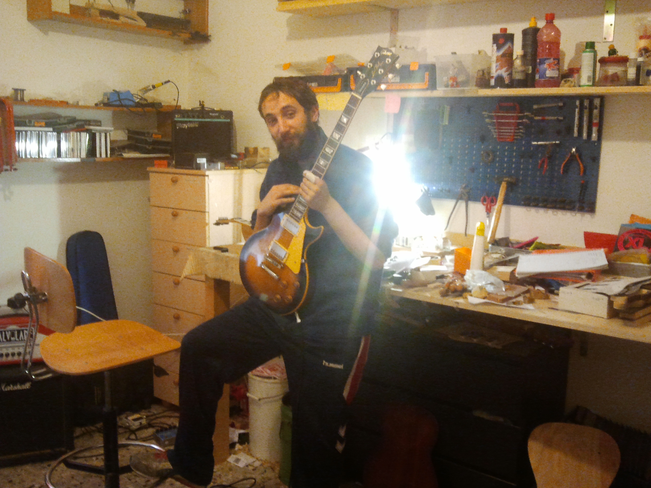 Torno da lui, parliamo un po’, approfondiamo la conoscenza. Tira fuori DARLENE e mi dice “Provala e dimmi se l’action è ok?”. L’action sarebbe l’altezza delle corde. Francesco ha inoltre sistemato il manico, e il pick up al ponte. Imbraccio la chitarra, Francesco infila il jack nel Marshall, faccio qualche svisata rock blues e fin da subito mi sembra diversa, regolata, in forma, ready for love. Francesco mi chiede di suonargli un riffone dei LED ZEPPELIN…parto con HEARTBREAKER…mi chiede di fare l’assolo, poi RAMBLE ON e infine chiudo con il riff veloce di BRING IT ON HOME. Francesco è soddisfatto. Pure io: che piacere suonare con la chitarra finalmente a posto, e che superfiga che sembra oggi DARLENE…guardate come è bella in braccio a FRANCESCO: