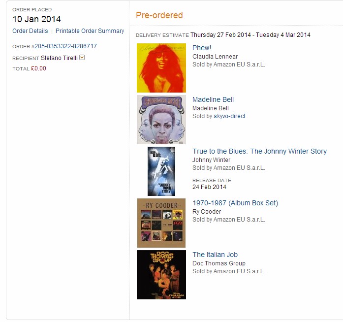 Alle 9 in punto sono dal cliente, poco dopo in ufficio davanti a un thé caldo. Alle 13 dovrò essere al Policlinico di Mutina a far rinnovare una carta medica per Brian, poi mi fermerò da lui e infine di nuovo qui in ufficio. Sono già stanco. Guardo fuori dalla finestra, grigiume… si ferma il furgone di un corriere, ho una scossa d’eccitazione, che sia uno dei pacchetti che Amazon UK (avevo scritto “OK”…sintomatico…) mi deve consegnare? Macché, il corriere suono nella palazzina di fronte. Vado sul mio account di Amazon UK a riguardarmi gli ordini fatti: