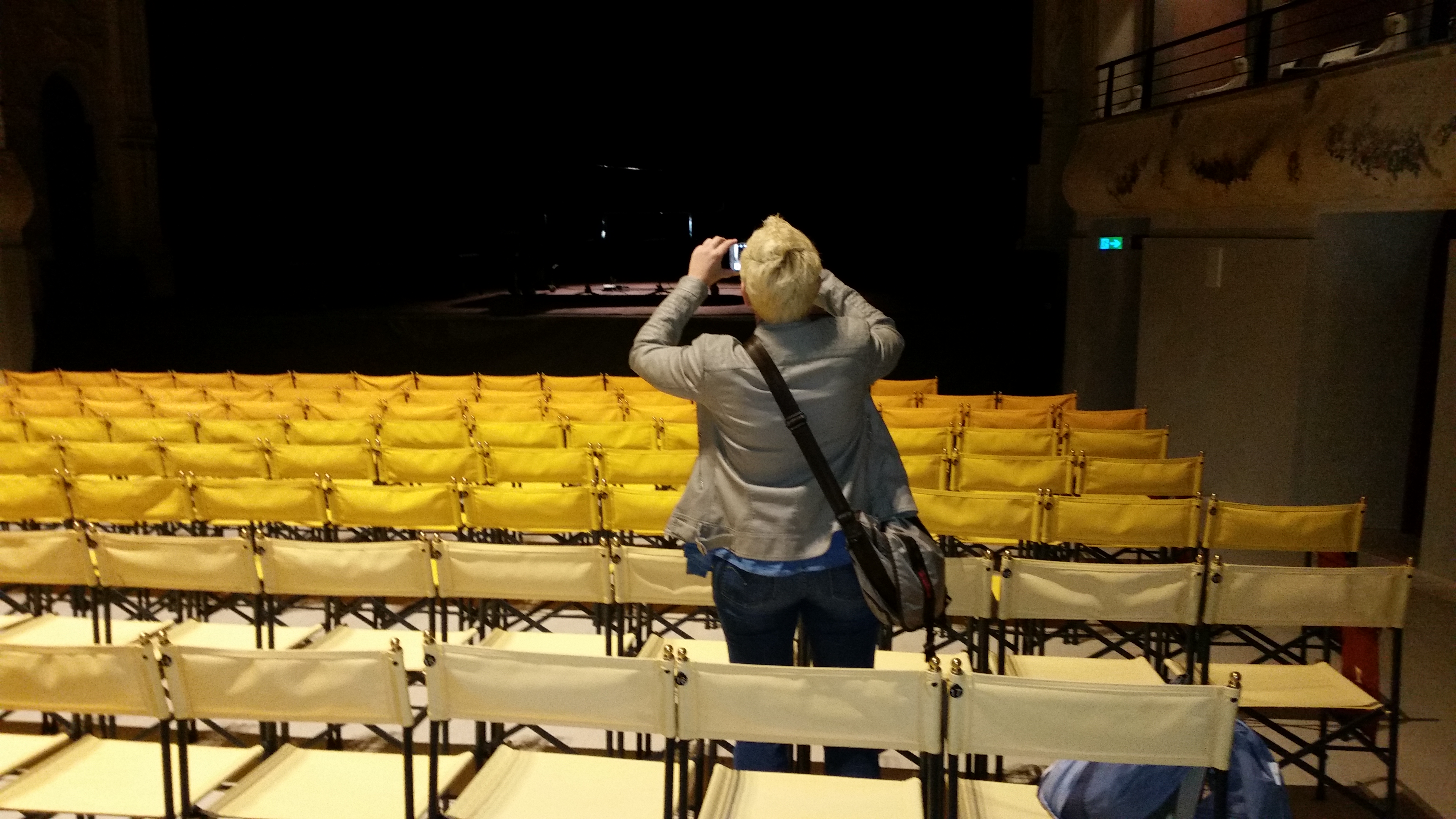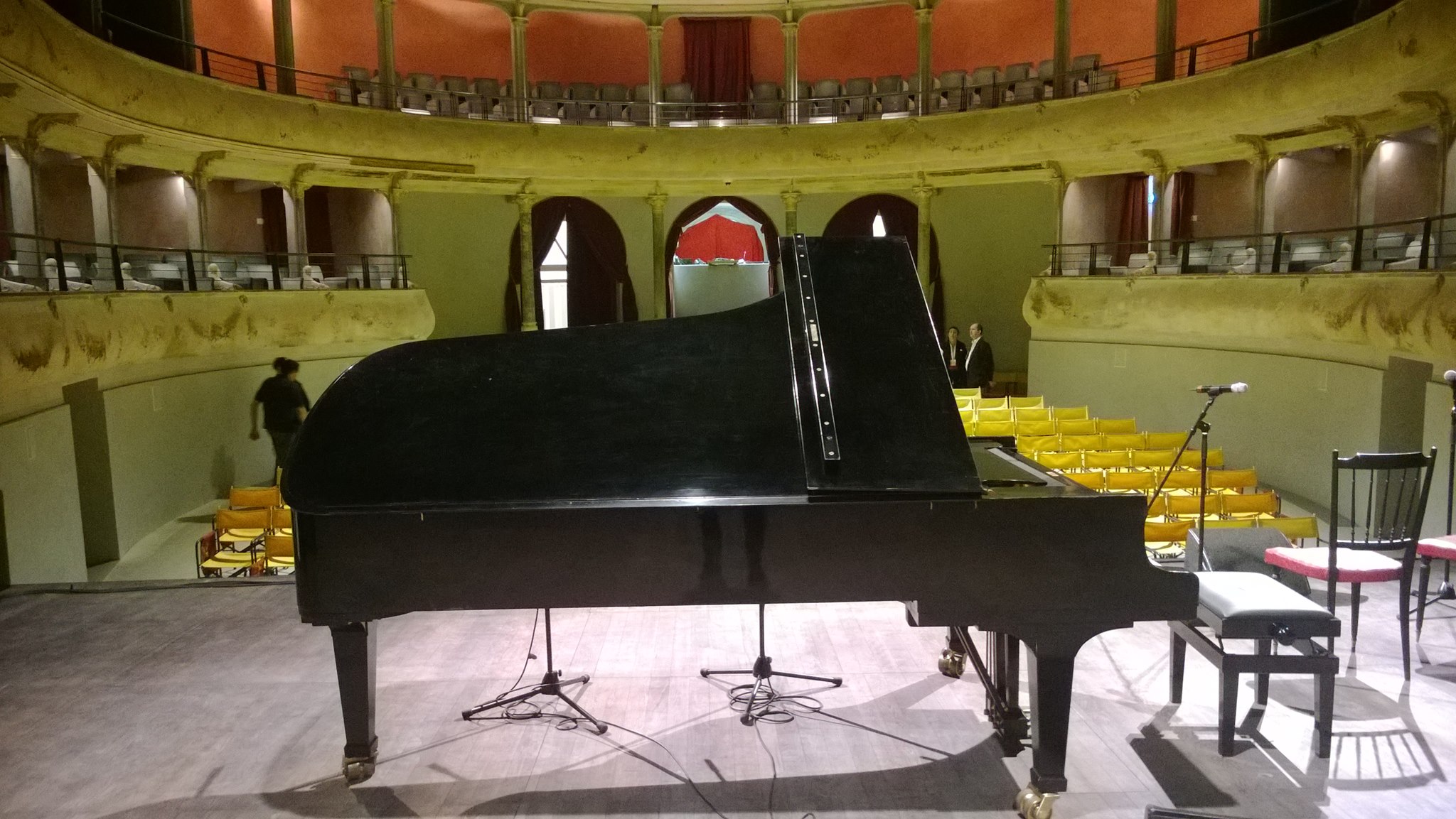 La groupie è contentissima e ha ancora l’espressione basita. Insieme ai ragazzi andiamo nel bar del teatro. Un panino, una birra, una pasta, un caffè. Verso le 20,30 entriamo. Il teatro è assai grazioso, e anche molto piccolo. Ma siamo nel “Ridotto”, la sezione già restaurata, il resto dovrebbe completarsi entro l’anno. Teatro ricco di storia, eretto nel 1909 soprattutto grazio al contributo di ALESSANDRO ROSSI, il proprietario della famosissima (e grandissima… almeno per allora) fabbrica LANEROSSI (nome che a noi patiti di calcio di una incerta età non può che portare a galla ricordi legati alla maglietta a strisce biancorosse, quella con con la R ricamata sul cuore, quella del LANEROSSI VICENZA appunto)…