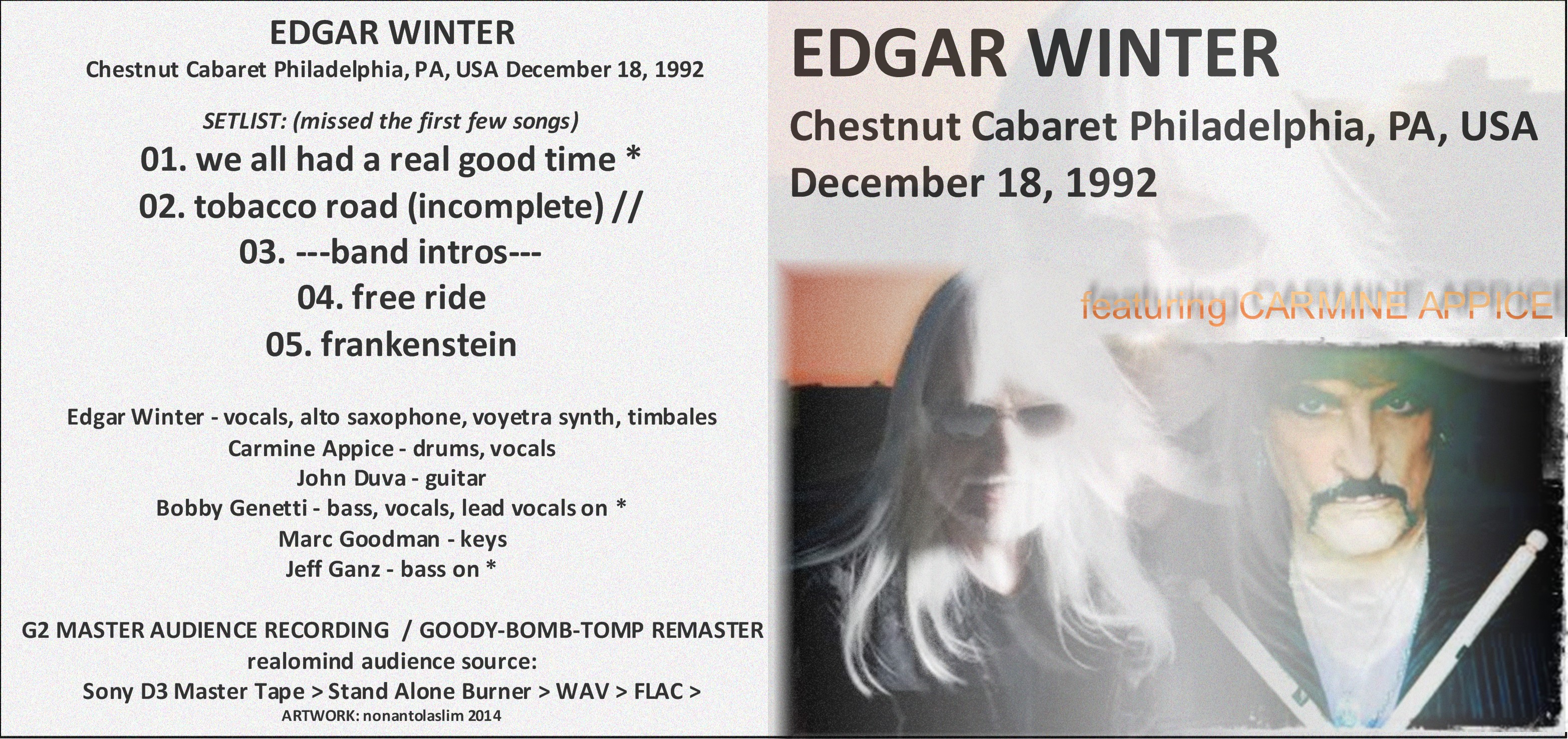 Registrazione live di una delle poche date che EDGAR WINTER fece coL grande CARMINE APPICE alla batteria nel 1992. Bootleg trovato di recente.
