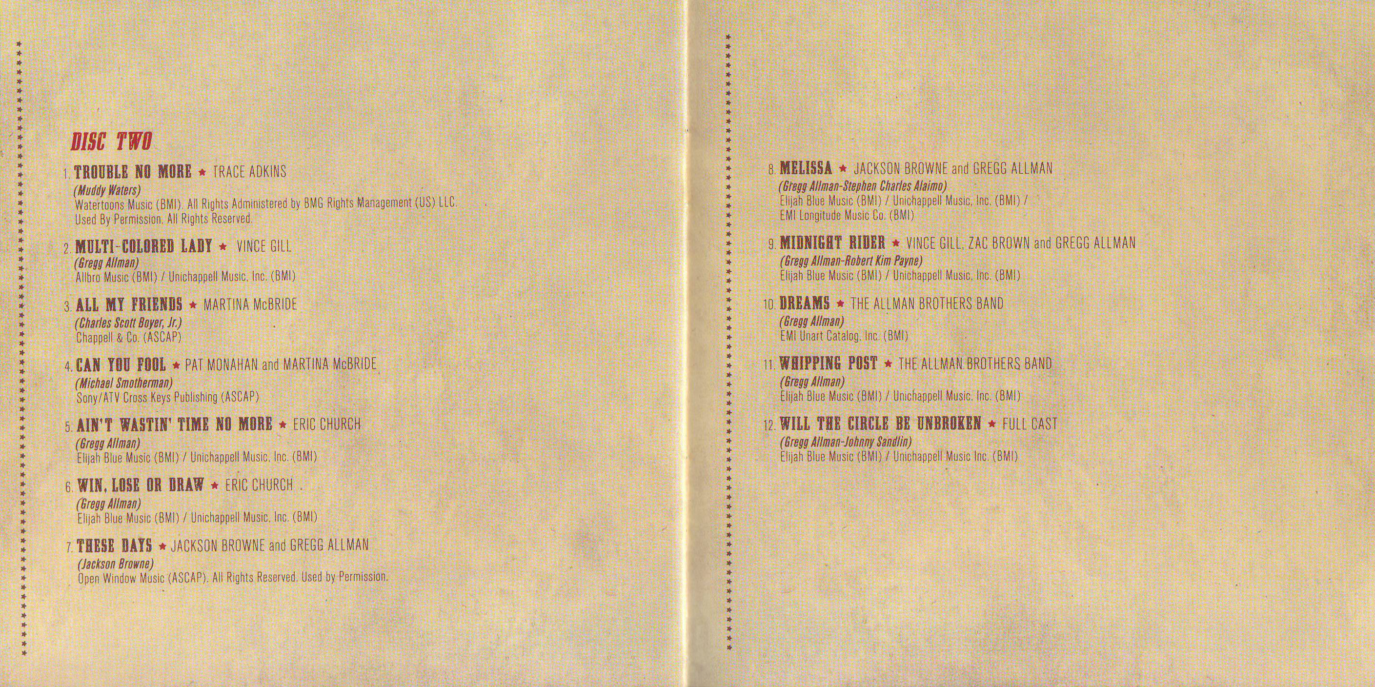 Nell’ascoltare questo doppio album live a tratti si soffre della sindrome dell’ultimo ERIC CLAPTON (quel senso di vertigine dovuto all’inutilità e al vuoto di sentimento), ma in qualche modo ci si ritrova in pista poco dopo grazie all’approccio talvolta sanguigno di certi musicisti coinvolti. Forse aiuta il fatto che è un tributo autocelebrativo registrato da vivo, oppure sono certi pezzi degli ALLAMN BROTHERS o di GREGG a riportarci sul giusto sentiero, fatto sta che alla fine il risultato è abbastanza convincente. Attenzione, è tutto un su e giù, ma i su rinfrancano lo spirito.