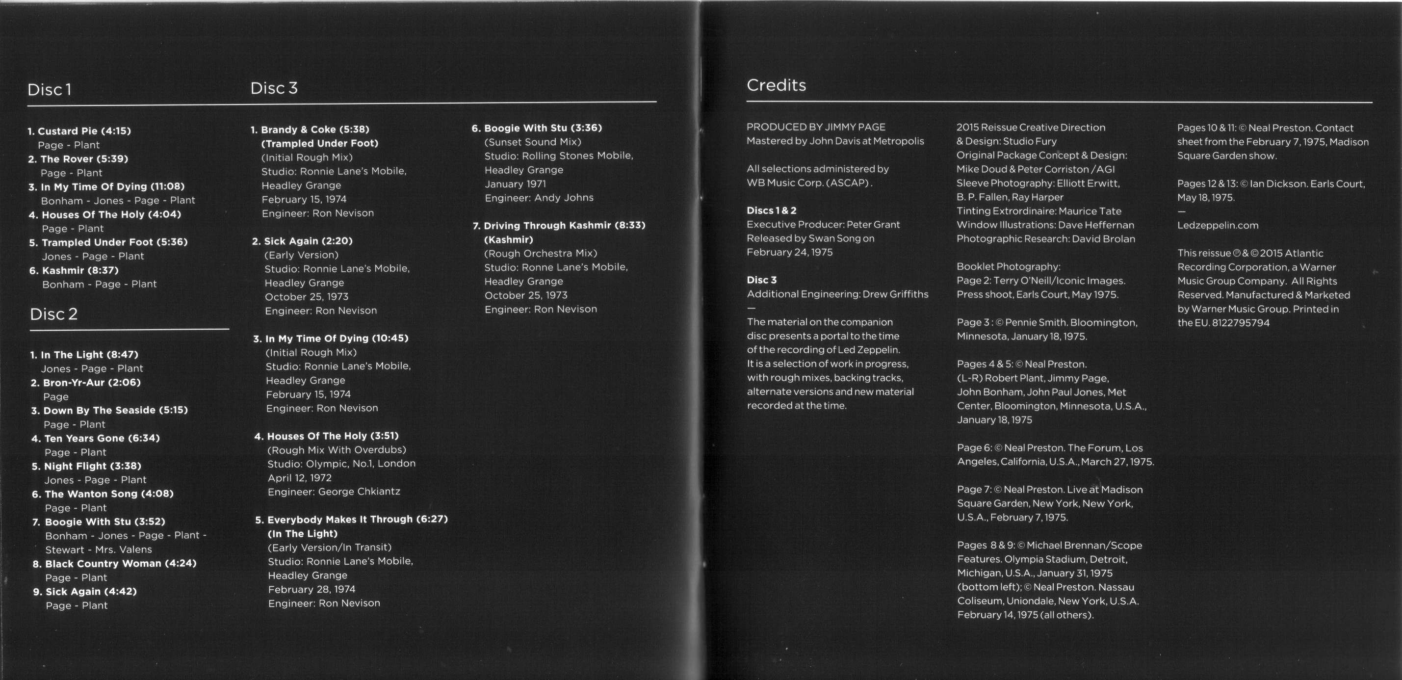 Il nuovo remaster, come ho già avuto modo di dire riguardo ai precedenti, mi pare ottimo. Mi sembra di non aver mai sentito così bene il clavicordo (si, insomma, il clavinet) di JONES in CUSTARD PIE sul canale sx. In IN MY TIME OF DYNG la voce mi sembra si senta meglio rispetto alle versioni precedenti mentre in TRAMPLED UNDERFOOT sento (più o meno distintamente) la chitarra funk col wah wah di PAGE poco prima dell’assolo, cosa che forse non avevo mai notato prima. Forse sono suggestioni…