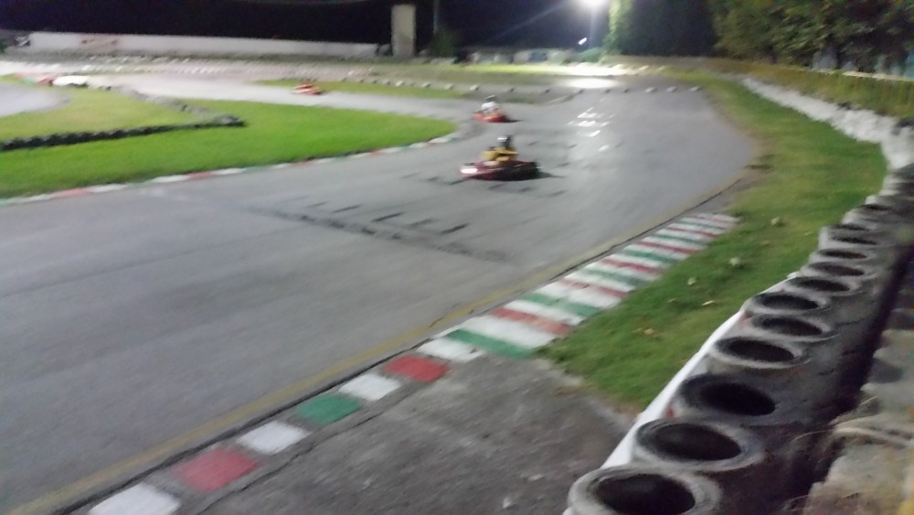 Il mare è comunque una scusa, siamo qui affinché la groupie possa correre in go-kart. Per tre sere l’ accompagno in questo bel circuito che non frequenta da due anni, in tutto 8 gare: sette volte prima e una volta seconda; “il secondo posto è un cruccio” mi dice, “il kart che mi hanno dato non andava”. Inoltre ha centrato il 5° miglior tempo del circuito dell’anno in corso. Certo, sono “gare” fatte da appassionati che si ritrovano al momento, non sono gare ufficiali di campionato, ma vederla nella tuta gialla (colore riservato alle donne), sfrecciare tra le tute rosse (riservate agli uomini), e vedere il numero del suo kart continuamente nella prima posizione del tabellone luminoso mi riempie come sempre di meraviglia. In pista più o meno 20 concorrenti alla volta, lei li supera tutti, se non si spostano li sbatte fuori, alcuni li doppia. Ormai la conosco la mia groupie, ma mi sorprendo ogni volta… una che abbia un talento del genere in due discipline così distinte tra loro (la velocità e la musica) non è cosa comune.