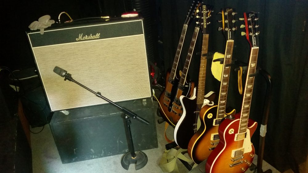 Bighellono sul palco mentre Lele prova i suoni. Do un’occhiata alle miei chitarre, stasera ho portato con me Cherry, Darlene, Fulvia e Doublene…