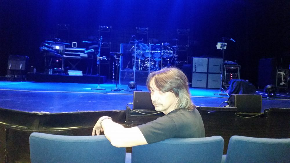 Nemmeno il tempo di trovarci di fronte al teatro che ci viene incontro Maurizio Cavalca, uno dei più grandi fan italiani degli YES (e di Steve Howe in particolare). Ormai è il quarto o quinto concerto che vediamo insieme, dopo gli YES a Padova nel 2014, e RICK WAKEMAN ad Asti, Vicenza e Schio. Maurizio ci racconta che poco prima BILLY SHERWOOD (il multi strumentista che stasera sostituisce the great late CHRIS SQUIRE) ha comprato una maglietta farlocca in una delle bancarelle di fronte al teatro commentando: “anche se non ufficiale è l’unica dove c’è anche la mia faccia”. Giusto il tempo di ridere della cosa ed eccolo di nuovo intento ad andare in giro. Saura lo ferma, lui è disponibilissimo e gentile, scatto una foto, BILLY mi guarda ed accenna qualche parola in italiano. Ringrazia Saura, la abbraccia e ci saluta. Tipo simpatico Mr Sheerwood.