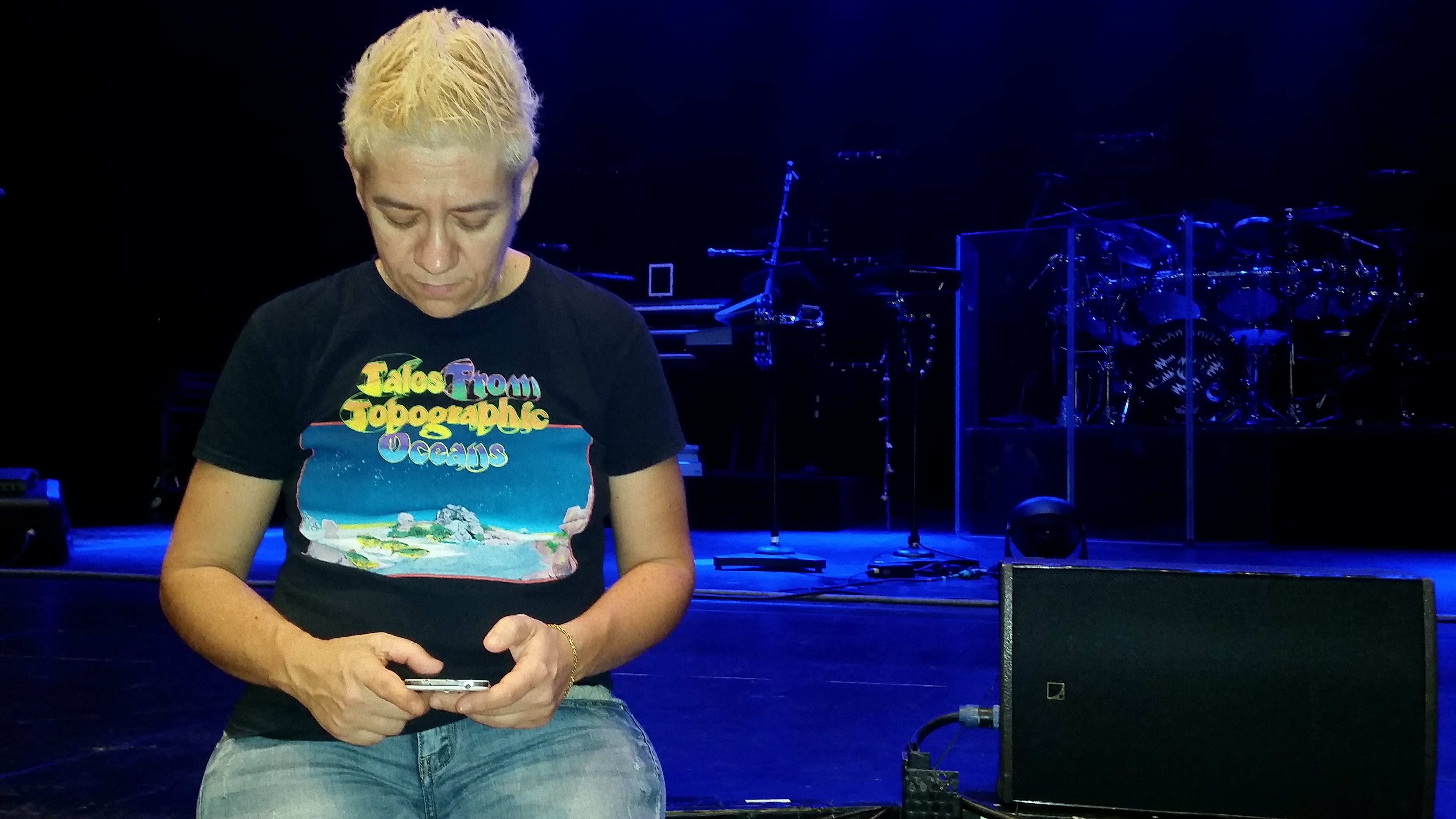 Aprono le porte, Saura si fionda nello stand del merchandising ufficiale io aspetto osservando il popolo del prog. Siamo in primissima fila, in due dei quattro migliori posti del teatro. Mica male. E’ la prima volta che assisto ad un concerto da una posizione così. E’ arrivato anche UMBERTO, altro superfan degli Yes, lui, Maurizio e Saura tutti in prima fila…mi sembra giusto.