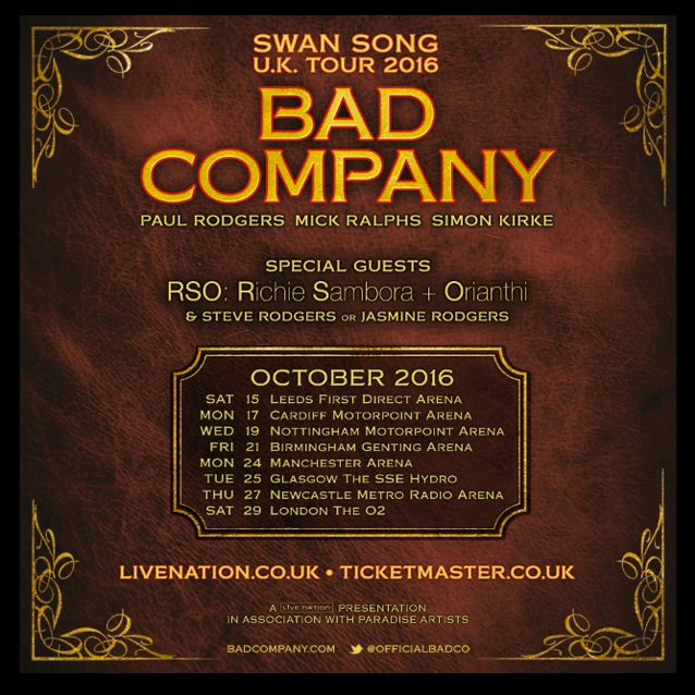 La Bad Company ha annunciato otto date previste per ottobre 2016 nel Regno Unito. Bollato come “SWAN SONG UK TOUR 2016” è probabile che sia l’ultimo tour, il canto del cigno appunto, se non altro per MICK RALPHS (sempre che sia della partita e non rinunci all’ultimo come ha fatto pe ril tour americano in corso in queste settimane) sempre più incline al ritiro dalle scene.
