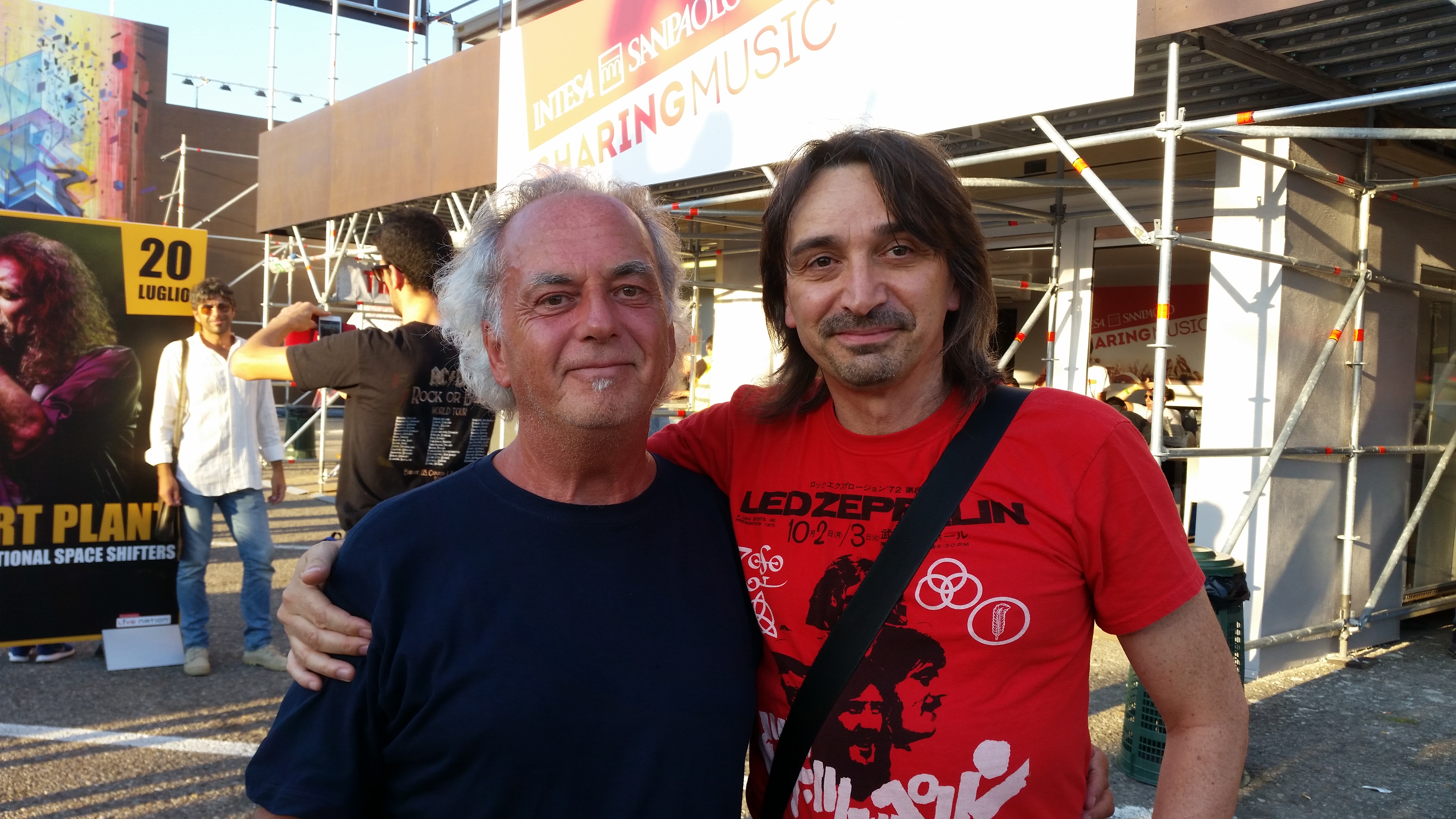 Il forum di Assago mi evoca sempre sensazioni positive. Nemmeno il tempo di arrivare ed ecco che MIKE BRAVO mi viene incontro. Poco dopo arriva DOC con la sua maglietta di PAGE versione doppio manico Chicago 1977 e quindi FRANK e la SILVIA. Un colpo di telefono e incontro anche MARCO GARONI di Milano, altro fan storico che conosco dai tempi della fanzine OH JIMMY.