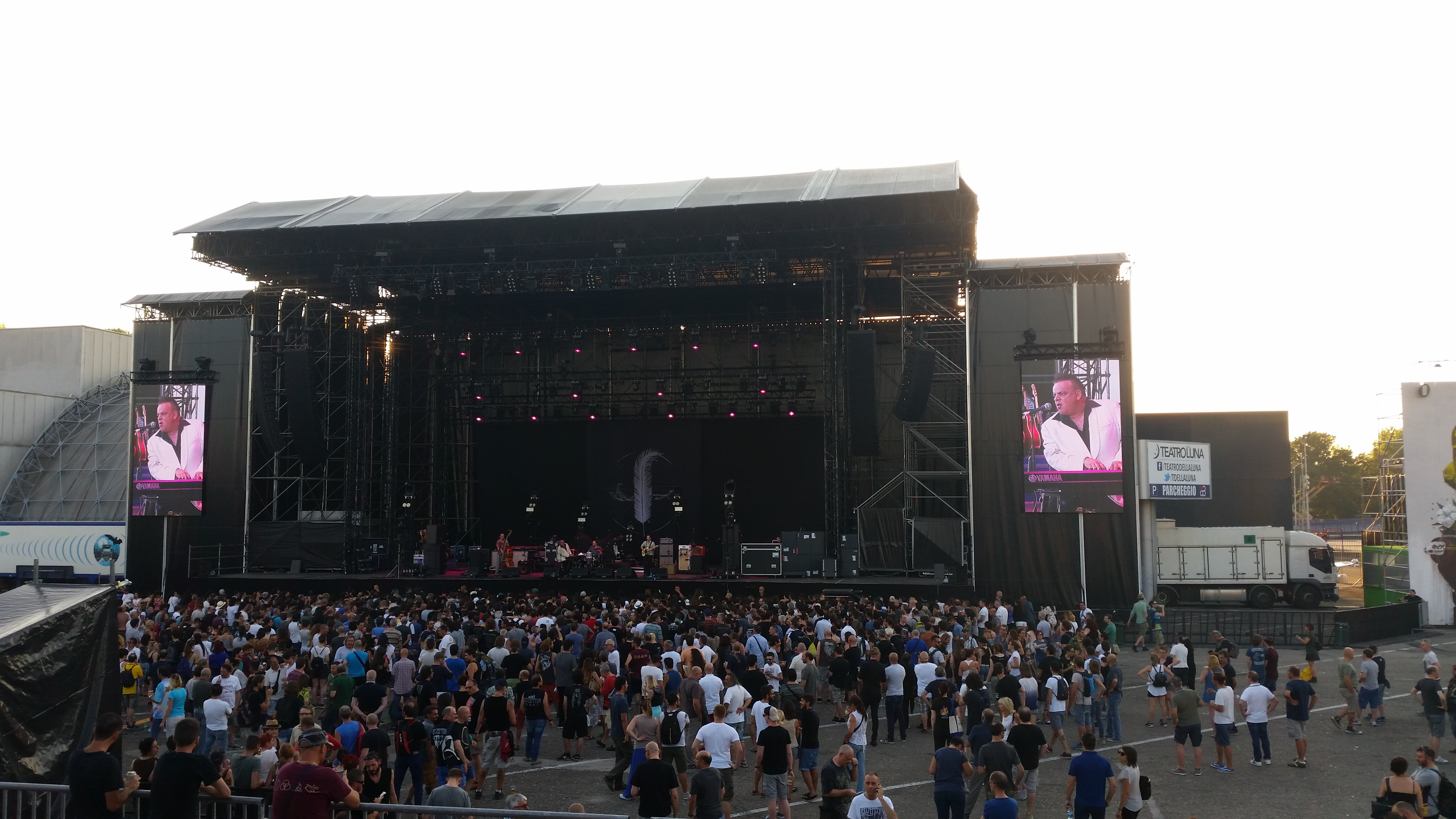 Entriamo. La Summer Arena non è altro che il piazzale antistante il forum a ridosso della tangenziale. Malgrado la location non sia granché, la situazione non è per nulla male. Anzi, è a misura di fan. Spazi ampi, bagni accessibili con facilità, stand di generi di conforto, assistenza. Bel lavoro. Mi faccio fare un scatto col manifesto del concerto.