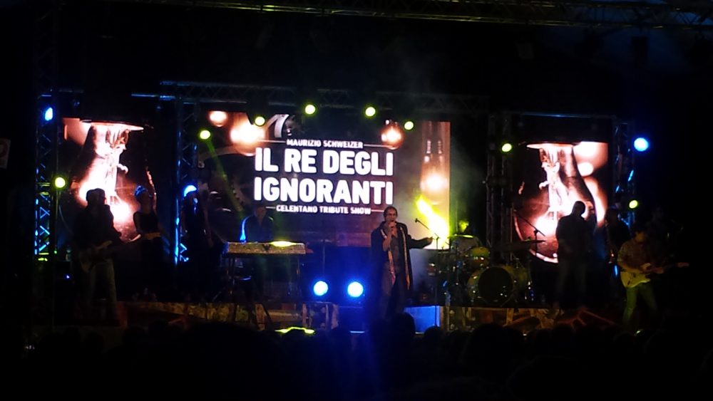 Cosa ci faccia io ad una festa in area ACLI a vedere un tributo a Celentano non è semplice da capire; il fatto è che sono curioso di vedere un tribute show altamente professionale. MAURIZIO SCHWEIZER e i suoi ragazzi (sono in 11 sul palco: Maurizio as Adriano, tre coriste, tre fiati, un batterista, un bassista, un chitarrista e un tastierista) portano in giro uno spettacolo di livello, con una sceneggiatura definita, tempi studiati, recitazione all’altezza. D’altra parte IL RE DEGLI IGNORANTI TRIBUTE SHOW ha fatto tappa anche in Francia, Ucraina, Spagna, Lettonia, Kazakhstan, Germania, Cipro, Moldova, Turchia e persino a Chicago e New York.