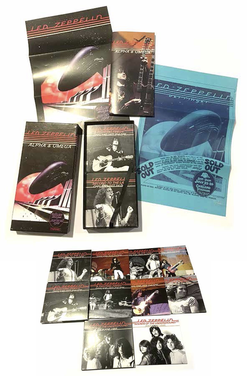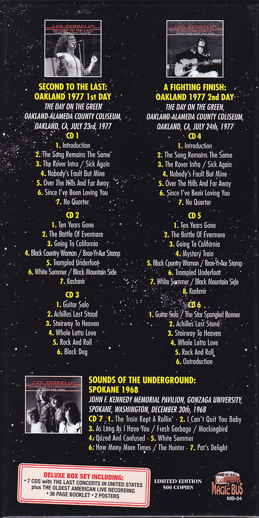 Nuovo cofanetto per l’etichetta Magic Bus, ennesima ristampa di concerti dei LZ tratti da registrazioni live già disponibili da decenni nel circolo degli appassionati. L’etichetta rispolvera il titolo oroginale di un vecchio bootleg, Alpha e Omega, dalla A alla Zeta insomma, difatti il box set in questione contiene il concerto più antico dei LZ ad essere disponibile su nastro (Spokane 30/12/19768) e gli ultimi due concerti del 1977 ad Oakland, dunque il primo (30/12/1968) e l’ultimo (24/7/1977) in terra americana.