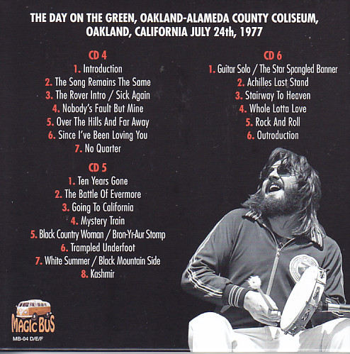 Eccoli qui i LZ al DAY ON THE GREEN, concerti eventi organizzati da Bill Graham all’Alameda County Coliseum di Oakland. Concerti tenuti al pomeriggio, gruppi spalla Judas Priest e i Derringer. La qualità audio è scarsa, ma ascoltato in cuffia con la giusta propensione e passione per i LZ, il concerto si ascolta. Siamo nel 1977, per di più nel pomeriggio, chiaro che il gruppo ha qualche sbavatura, ma dalla registrazione audience quel che si percepisce è un sound potente, grosso, greve, pesante. TSRTS e SICK AGAIN tramortiscono, JOHN BONHAM nel 1977 era davvero una furia umana. Robert Plant saluta il pubblico con un”Good Afternoon” convinto. Anche al terzo pezzo non si può non notare Bonham: feroce, efficace, superbo. SIBLY si ascolta quasi con piacere, il pezzo come sappiamo lascia respirare la musica e l’ascolto ne giova, il fruscio disturba un po’ ma, tenendo conto della qualità non eccelsa della registrazione, il risultato non è niente male. NO QUARTER elettrizza il pubblico, sebbene sia un pezzo da atmosfera serale e notturna. Nel mezzo dell’assolo di Jones la fonte cambia, il fruscio sparisce e la qualità migliora almeno per qualche minuto.