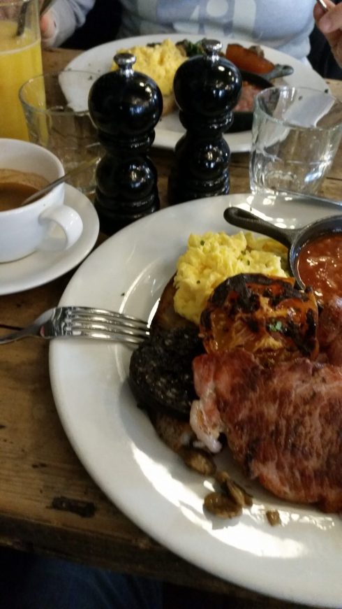 Ordino una colazione full english. Beacon, salsiccia, uova, pane, funghi, fagioli e altre inglesate. Per cercare di buttar giù tutto ordino anche un double espresso. Saura prende una piatto vegetariano. Il personale è molto gentile. Totale colazione 28 sterline, 35 euro. Sono le 10. Fino alle 7 di sera non toccheremo cibo.