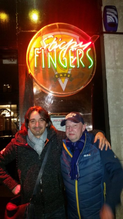 Per la cena Saura mi porta allo Sticky Fingers, ristorante di Bill Wyman. Ci arriviamo in underground. Sbuchiamo in Kensington street. Le chiedo se si è informata e se occorreva prenotare, mi dice che non ci dovrebbero essere problemi. Entriamo, di solito sono io quello che parla in inglese, ma vengo attratto da un quadro raffigurante BRUSSELS AFFAIR, uno dei più bei live di tutti i tempi. Sento che Saura borbotta col cameriere. Benché il locale sia quasi vuoto ci accompagna in un tavolo in fondo alla sala, arriviamo al posto e chi trovo? Billy e Alison Fletcher, i miei amici scozzesi. In un attimo capisco che mi hanno voluto fare una sorpresa e che hanno organizzato tutto alle mie spalle. Mentre abbraccio Billy gli dico “You loosy bastard!”. Siamo amici dal 1985, da quando cioè iniziai la mia fanzine. Questa è la quarta volta che ci vediamo, dopo quelle del 2000, 2004 e dell’anno scorso a Glasgow per il concerto della Bad Company. Che gioia, il mio amico Billy Fletcher, the mighty come lo chiamo io, fa parte della mia storia. Bermi una birra in sua compagnia è un gran piacere.