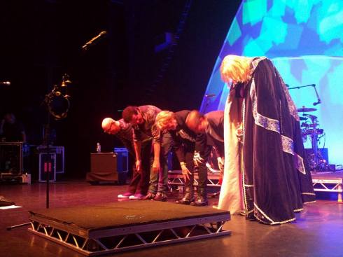 Non credo sia il caso e infatti procedo con semplici saluti. Arrivo da Wakeman, lo guardo e gli dico “Buonasera Rick, non so se ti ricordi di noi…” “Sicuro che mi ricordo” mi fa “Siamo gli amici del tuo promoter italiano” “ma certo, lo so. State bene? Tutto ok?”. Uh, che Wakeman inizi a riconoscerci non è male, ma mi spaventa anche un po’, in che buraccione mi ha infilato Saura?