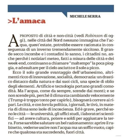 La mancanza di precipitazioni continua a preoccuparmi. Da ottobre ad aprile abbiamo avuto solo 4 o 5 eventi piovosi (e niente neve), e mentre la gente ignara del pericolo è contenta io registro segnali per niente positivi. La settimana scorsa Michele Serra ha scritto qualcosa a riguardo su cui vale la pena riflettere.