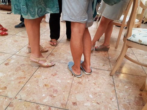 Sono felice per loro, li abbraccio e bacio con affetto, poi mi seggo con Saura a bere un prosecchino niente male. Poco dopo iniziano ad arrivare i loro compari musicisti. Ora, so benissimo che l’essere informali tra i musicisti è un way of life, ma vedere arrivare ad una festicciola pre nozze gente vestita senza un minimo di rispetto per sé stessi e per gli altri, mi fa andare di traverso gli stuzzichini che sto mangiando. A rischio di apparire snob e ripetitivo guardo Saura e le dico “Ma è possibile!?“. Uno con una maglietta sudacenta (insomma non proprio lavata di fresco), pantaloni lunghi sformati stile zio Fedele che accudisce le galline in campagna, un’altro in maglietta bianca di cotone stropicciata, braghe corte blu modello Fantozzi e sandali modelli tognaro ai lidi ferraresi negli anni sessanta. Il top è rappresentato da un tizio che arriva con pantaloni corti sbrindellati ed espadrillas portate a mo’ di ciabatta e per di più sporche. Ullallà, che sciatteria!