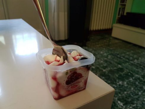 Alla cassa. Il panino morbido, alcune prugne e 4 piccoli brick di vino San Crispino.