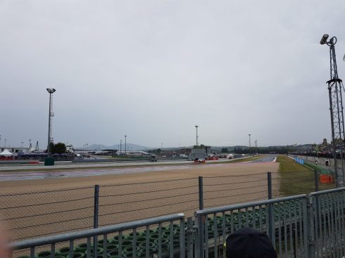 E’ una pioggia battente quella che scende, siamo tutti inzuppati. Incredulo osservo gente uscita in pantaloni corti e infradito come fosse un calda giornata di agosto. C’è un padre con un bambino di circa 10, entrambi in sandali pantaloncini corti e maglietta e un paio di ombrellini. Mi chiedo come si faccia ad essere così imprevidenti. Sono giorni che le previsioni mettono pioggia e freddo, come si fa a portare un bambino ad un gran premio in una giornata del genere senza una felpa o un giubbotto? Il bambino trema. Fosse per me togliere la patria potestà al padre.