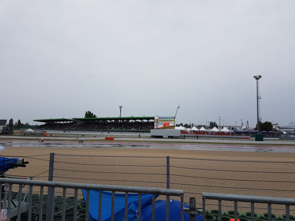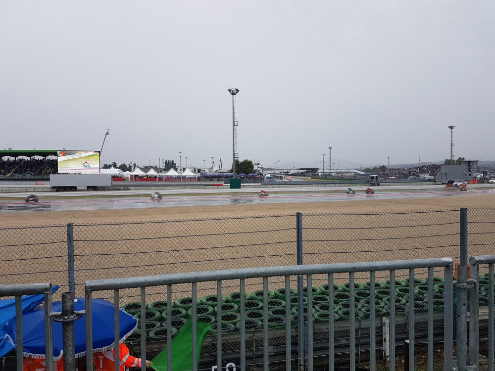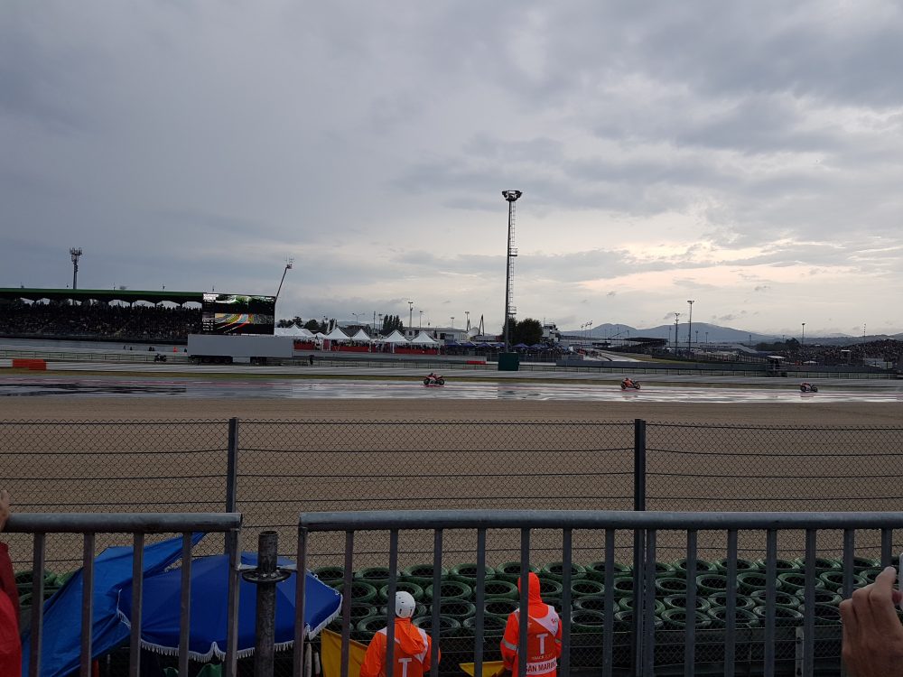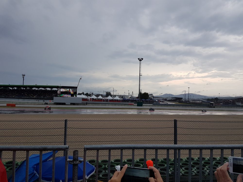 Alle 8,45 usciamo a Cattolica, mancano 5 km al circuito. Pensavamo che senza Valentino e con questo tempo terribile ci sarebbe stata poca confusione e invece … due ore di orologio per percorrere quei pochi km. La Yamaha girl è su tutte le furie, si perde i warm up e l’inizio della moto 3. Già stanchi e un po’ scossi finalmente prendiamo possesso dei nostri posti in seconda fila. Inizia a piovere forte. Non sono un appassionato del livello di Saura e Simonetta, conosco solo qualche pilota della Moto 3 così seguo distrattamente.