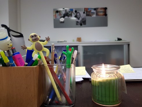 Sono in ufficio alle 8,30, alle 9 ho una riunione. Per colazione mangio una di quelle miscele di frutti esotici essiccati da nuffia, un po’ di frutta fresca e mi bevo un deca. Fuori dalle grandi finestre la pioggia continua a cadere. La luce artificiale dell’ufficio ben si intona con il blu livido del mattino. Accendo la candela al rabarbaro e thé nero che ho sulla scrivania.