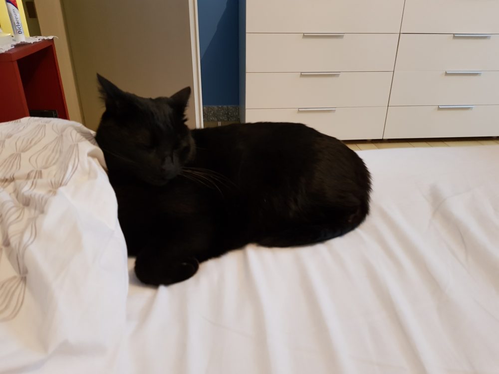 Nei mesi invernali la mia amicizia col gatto Palmiro si fa più intensa, con giornate più corte e fredde il diavoletto nero della Tasmania cerca i suoi umani con più frequenza. Di notte dorme nel lettone con noi, esattamente in mezzo poi, dopo che la sua umana si alza, gli dà da mangiare e infine esce per andare al lavoro, viene da me per una mezz’oretta di amicizia pura. Inizia a fare la pastella e le fusa su di me e poi si sdraia accanto a me infilando il suo muso sotto al mio mento. E’ piacevole nelle fredde e buie mattine invernali ritrovarsi con una sciarpona felina intorno al collo, una cotoletta di pelo nero che con la sua vicinanza ti mette di nuovo a tuo agio in questa porca vita. Sono anni che lo scrivo e lo vivo, l’interazione tra due mammiferi di specie diverse che vivono insieme mi sorprende sempre. Ringrazio il nulla cosmico onnipotente che ci ha messo l’uno nelle zampe dell’altro.