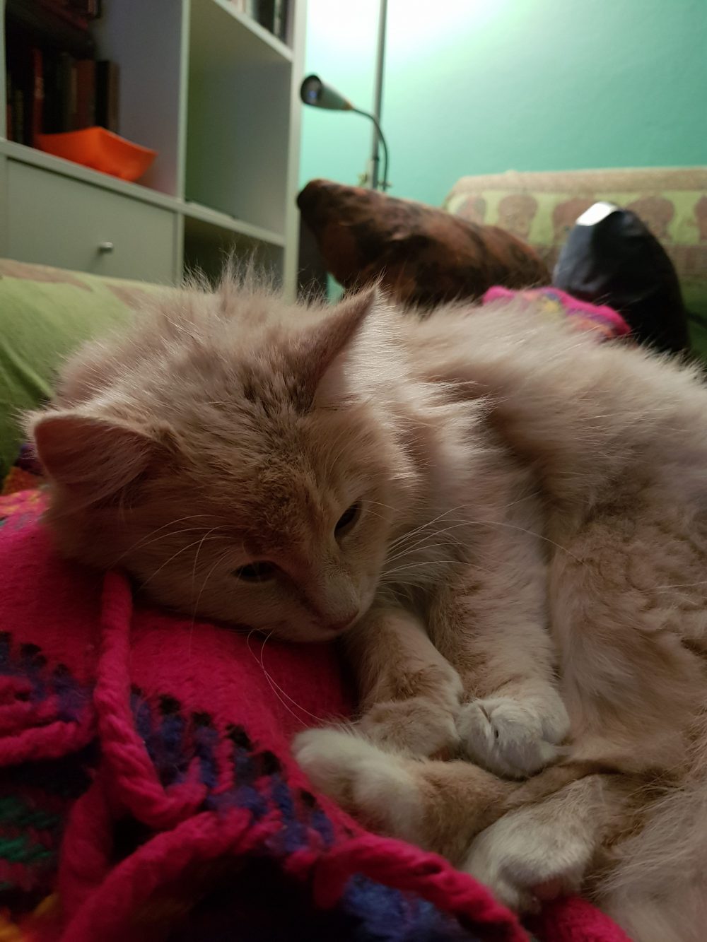 ma poi arriva la stanchezza e mi metto sul divano anche io. Palmir sente il bisogno del suo umano e mi si butta addosso.