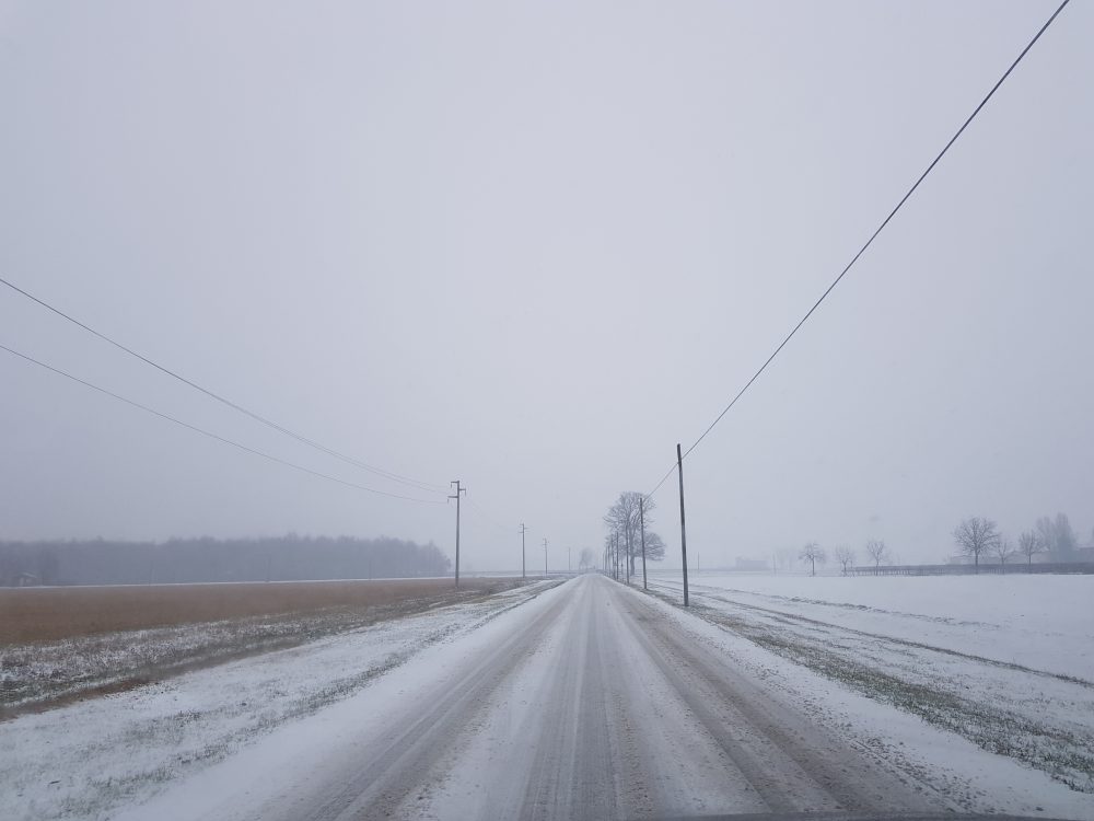 Al risveglio la neve ha ricoperto le campagne e le strade, per me ogni volta è uno spettacolo che lascia a bocca aperta. Mi metto in macchina. La Sigismonda (la mildly blues mobile) rolla piano sulle blue highway (le strade basse di campagna insomma),