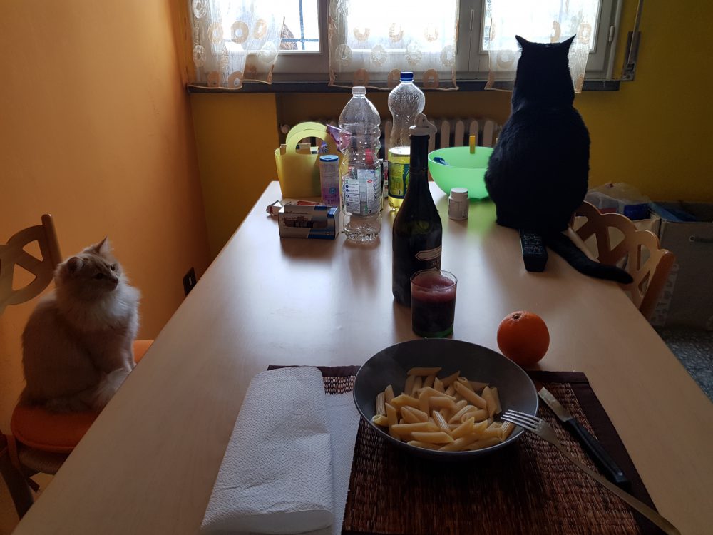 Mi preparo qualcosa da mangiare… una pasta in bianco, un bicchiere di lambrusco e un arancio, guardo la misera messa in tavola, con Palmiro e Strichetto a fare da sentinelle e mi chiedo se esiste qualcuno più blues di me.