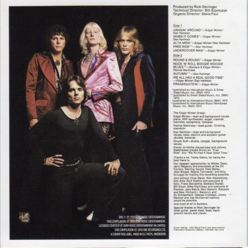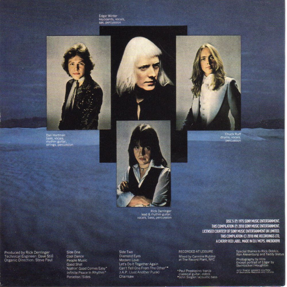 Cool Dance è di Hartman (songwriter extraordinaire come abbiamo visto), è un buon episdoio (magari più da White Trash che da EW GRoup), ma da lui forse ci si aspetterebbe di più. People Music (Winter) roccheggia e rimane su livelli discreti ma non decolla del tutto. Good Shot (Winter) pare un brano più adatto agli White Trash. Nothin’ Good Come Easy (Derringer) è un tempio medio chitarristico, molto gradevole in certe parti. Infinite Peace In Rhythm (Winter) sembra una outtake di They Only Come Out At Night. Carina e di nuovo guidata dalla chitarra, ma niente di strabiliante. Paradises/Sides (Hartman) è sognante e a tratti cosmica, Diamond Eyes (Winter) si stempera nell’easy listening, Modern Love di Derringersi si rifà un po’ sotto col rock, ma di quello funky e ballabile. Let’s Do It Together Again (Winter/Hartman) funkeggia in modalità standard, Can’t Tell One From Another (Hartman) è un country con tanto di dobro e chitarre acustiche. JAP (Derringer) è un rock semplice e adolescenziale. Chainsaw è uno strumentale di Winter che sì rifà alla formula di Frankstein, senza raggiungerne l’efficacia.
